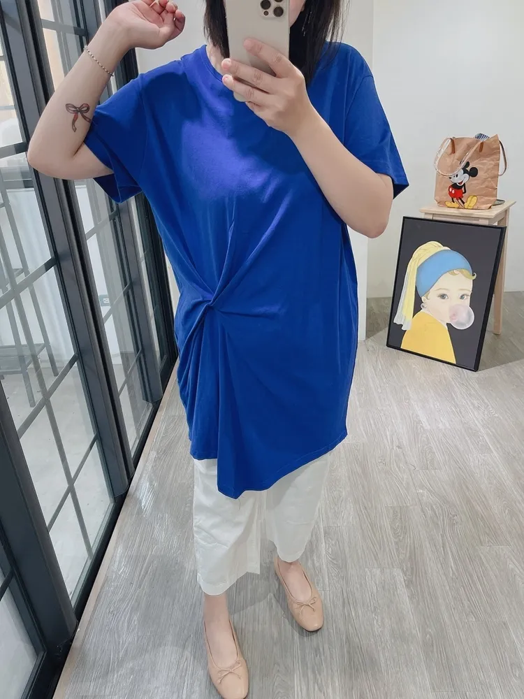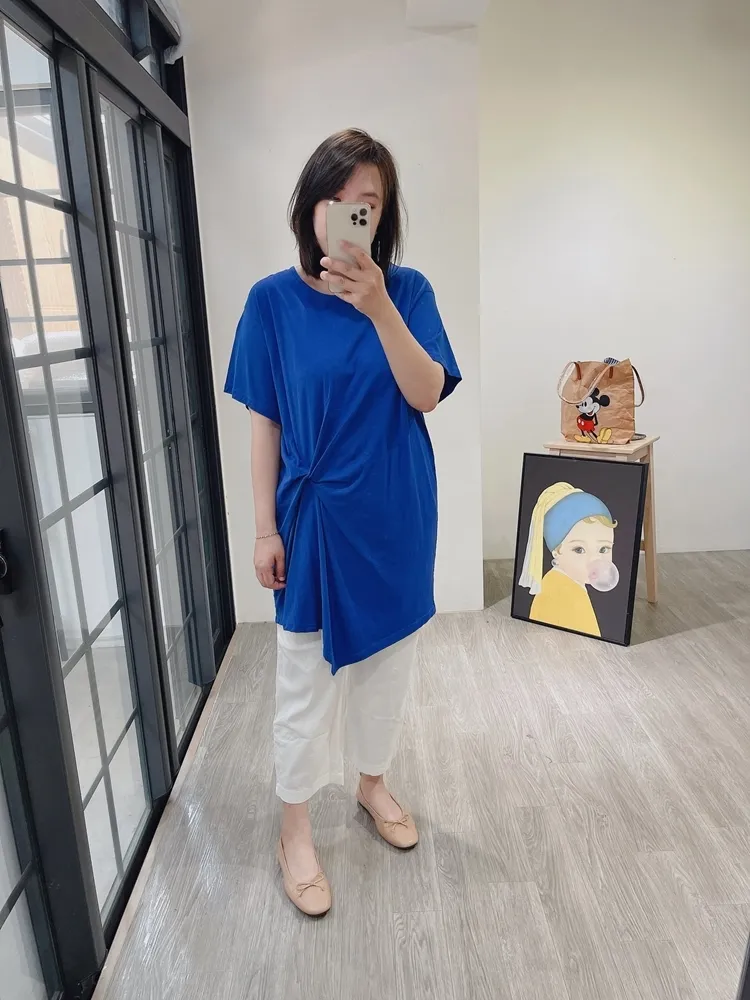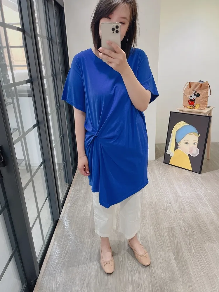 正面抓皺設計,讓單一件長版上衣多了小小設計感