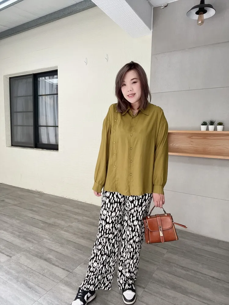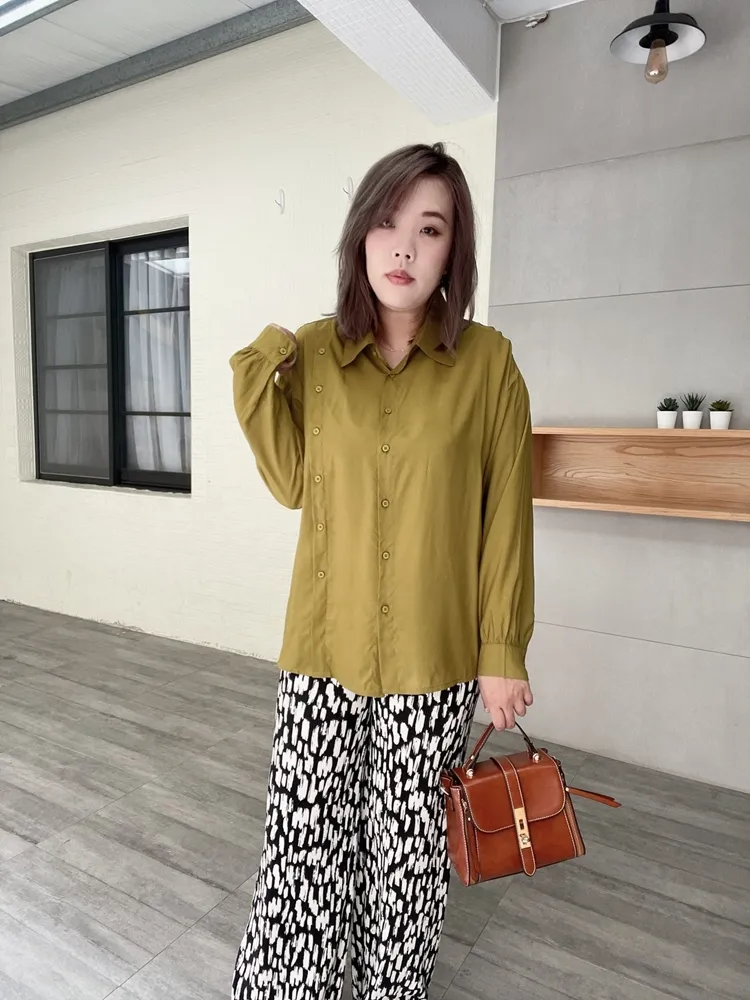 ✓ 側斜釦造型,釦子為裝飾