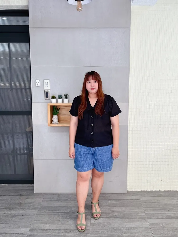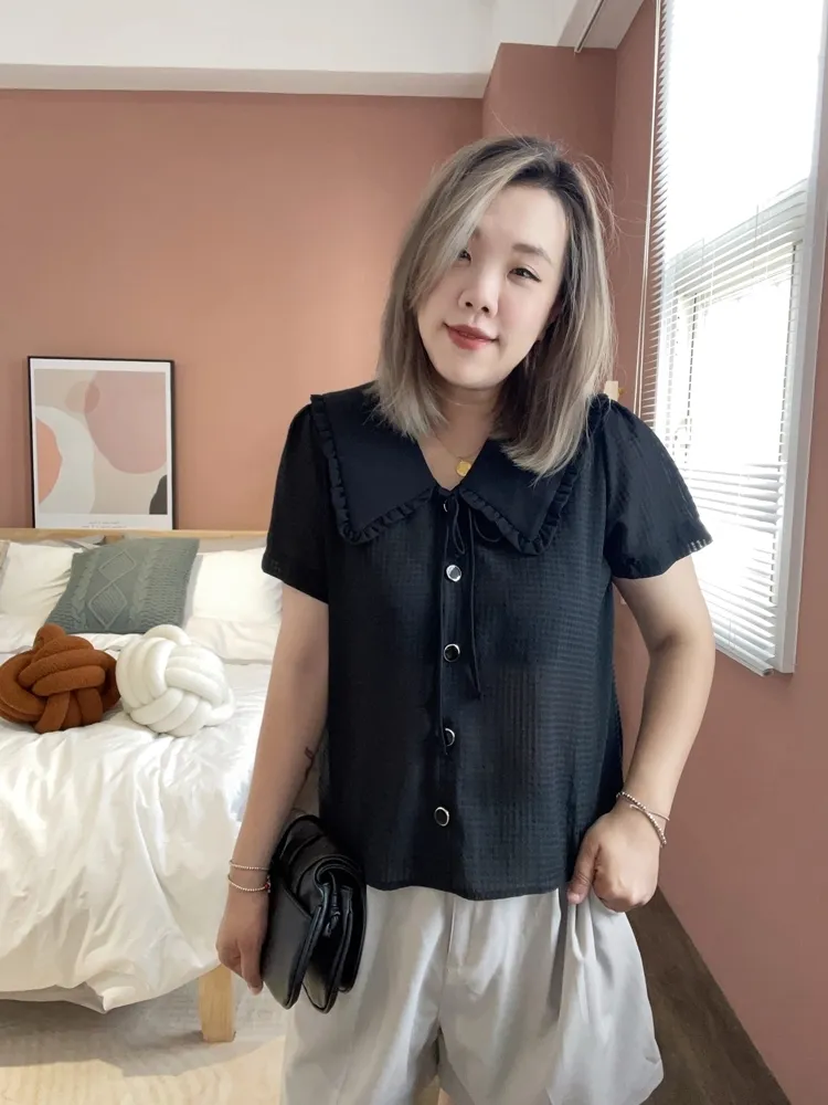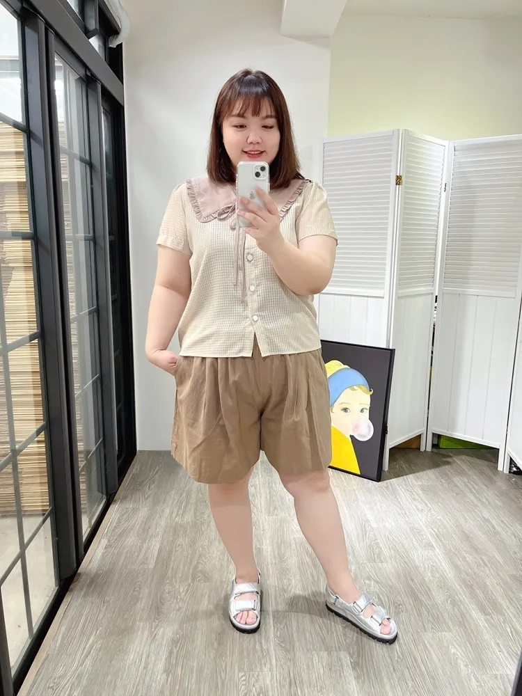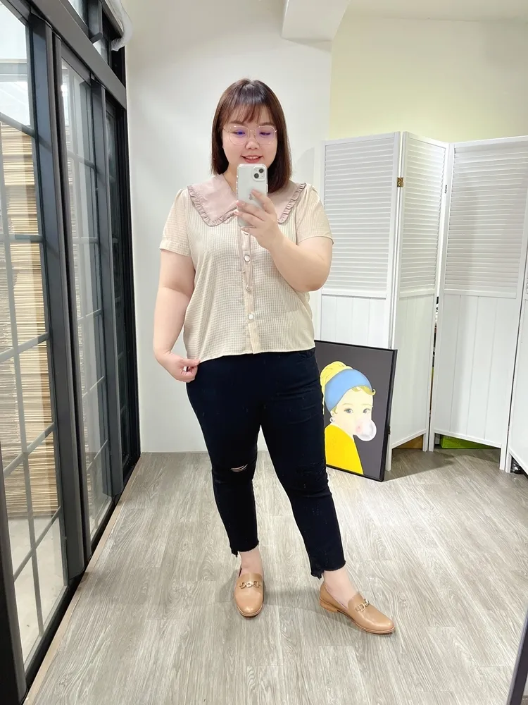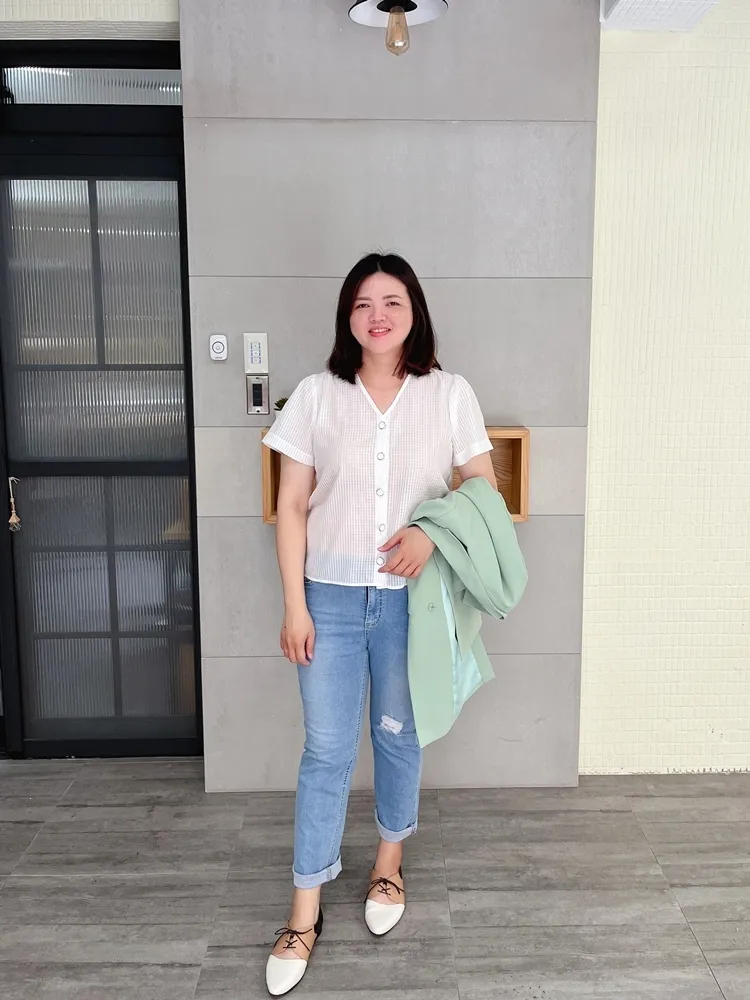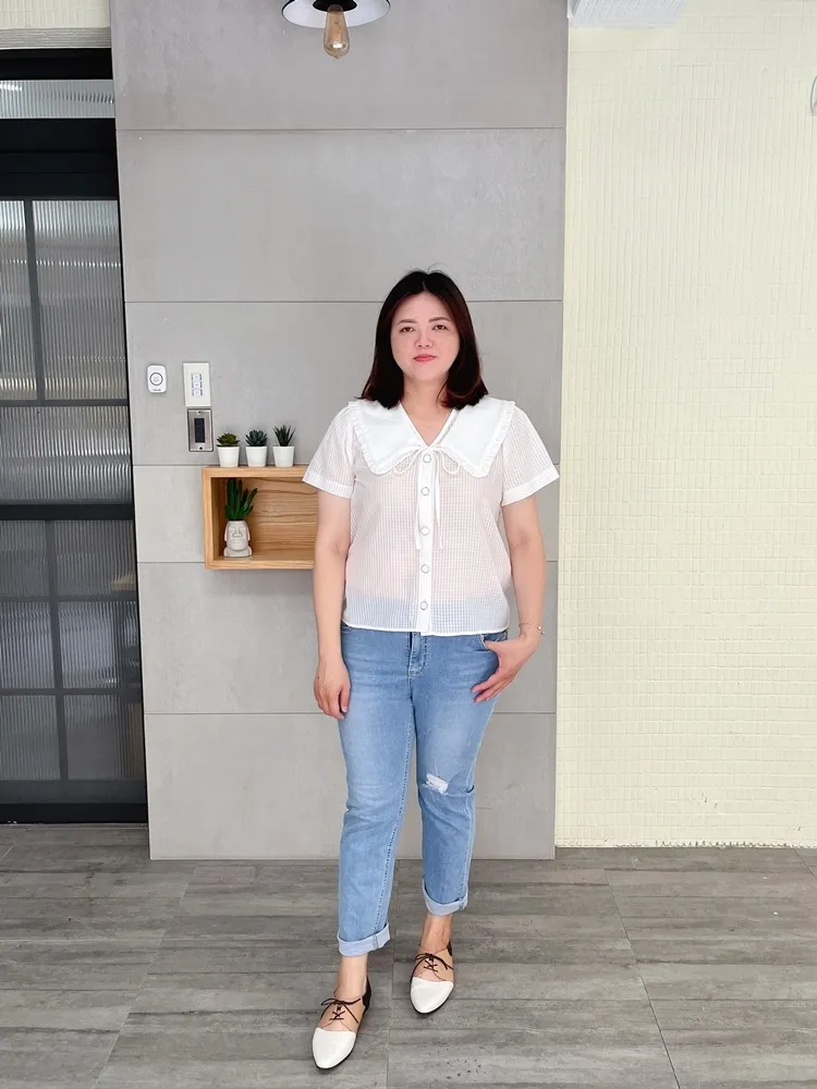 ✓ V領襯衫修飾脖子圓臉感,加上花邊領多了一分可愛感