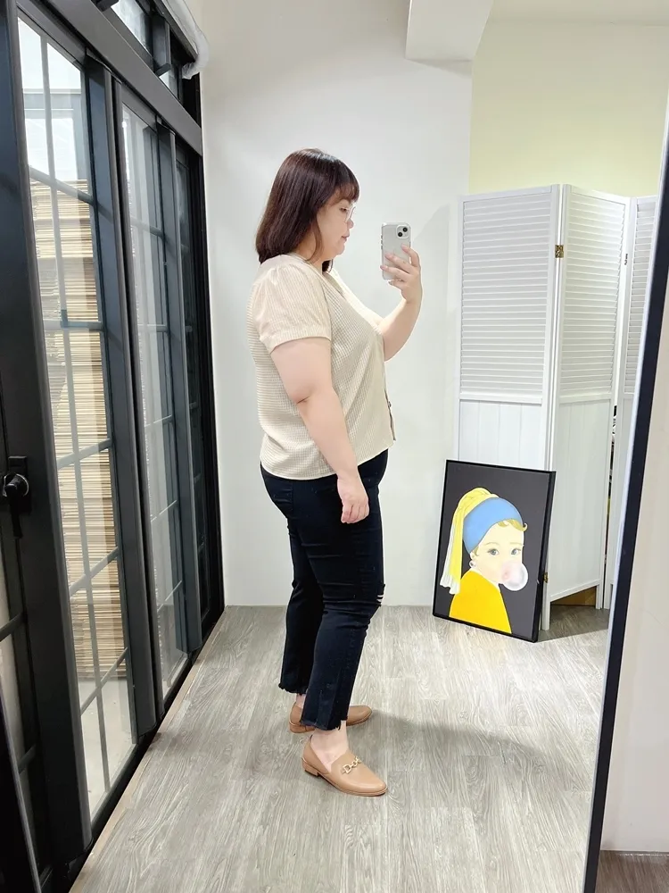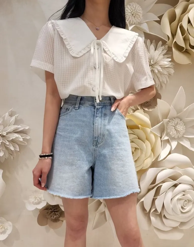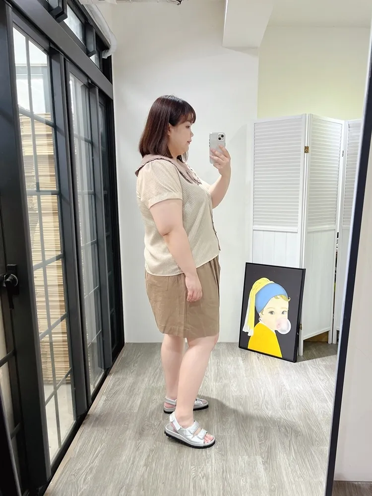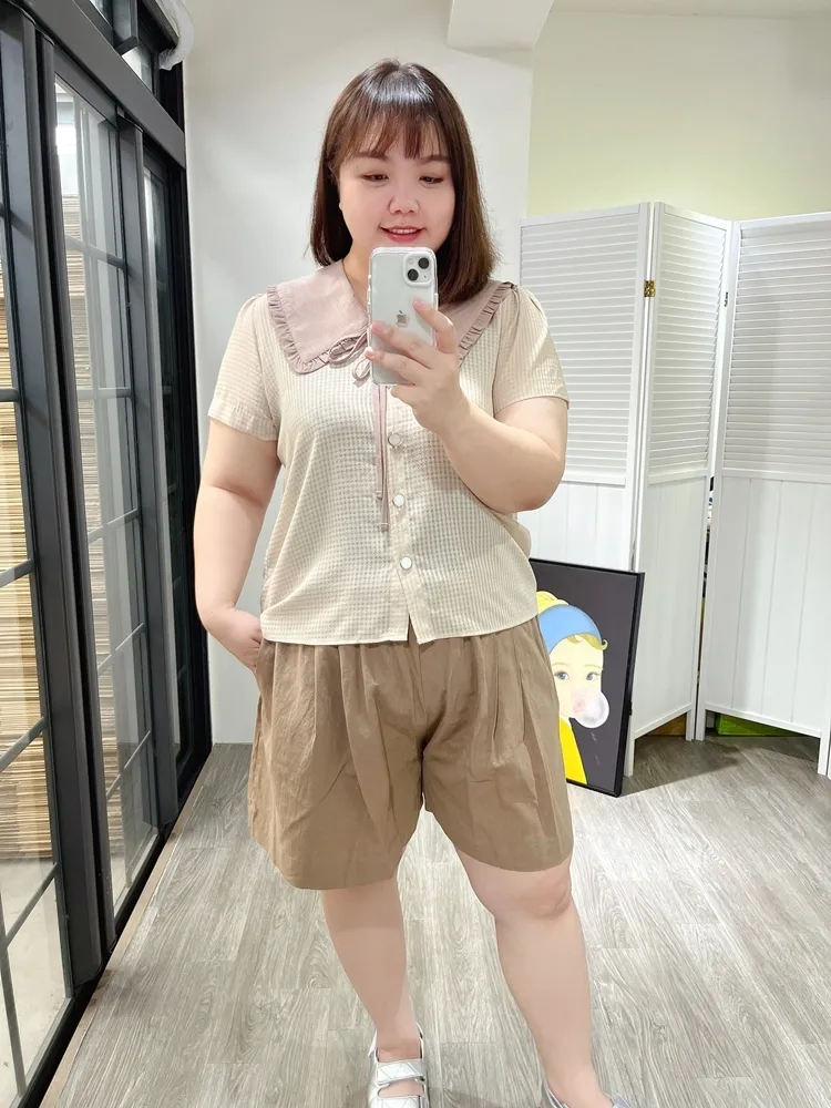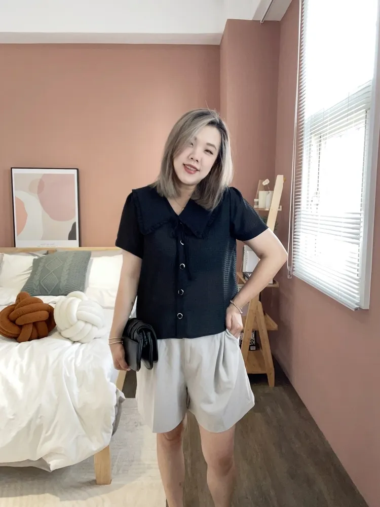 ✓ V領襯衫修飾脖子圓臉感,加上花邊領多了一分可愛感