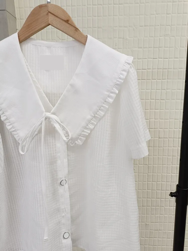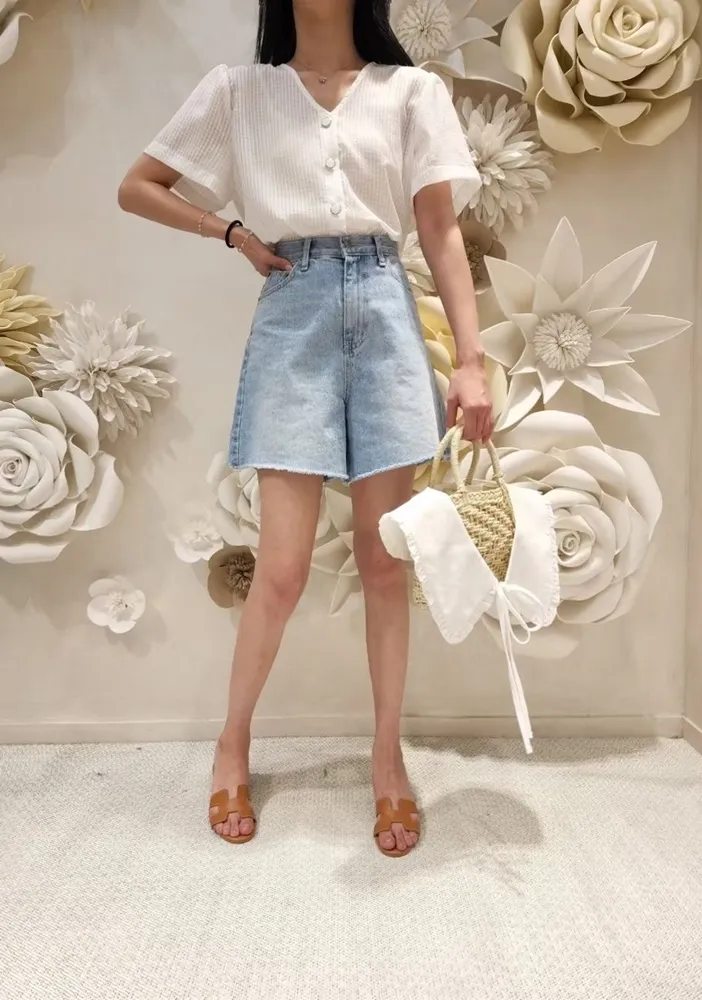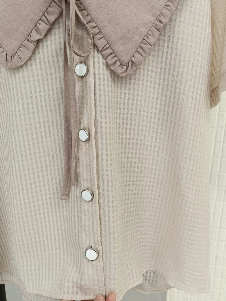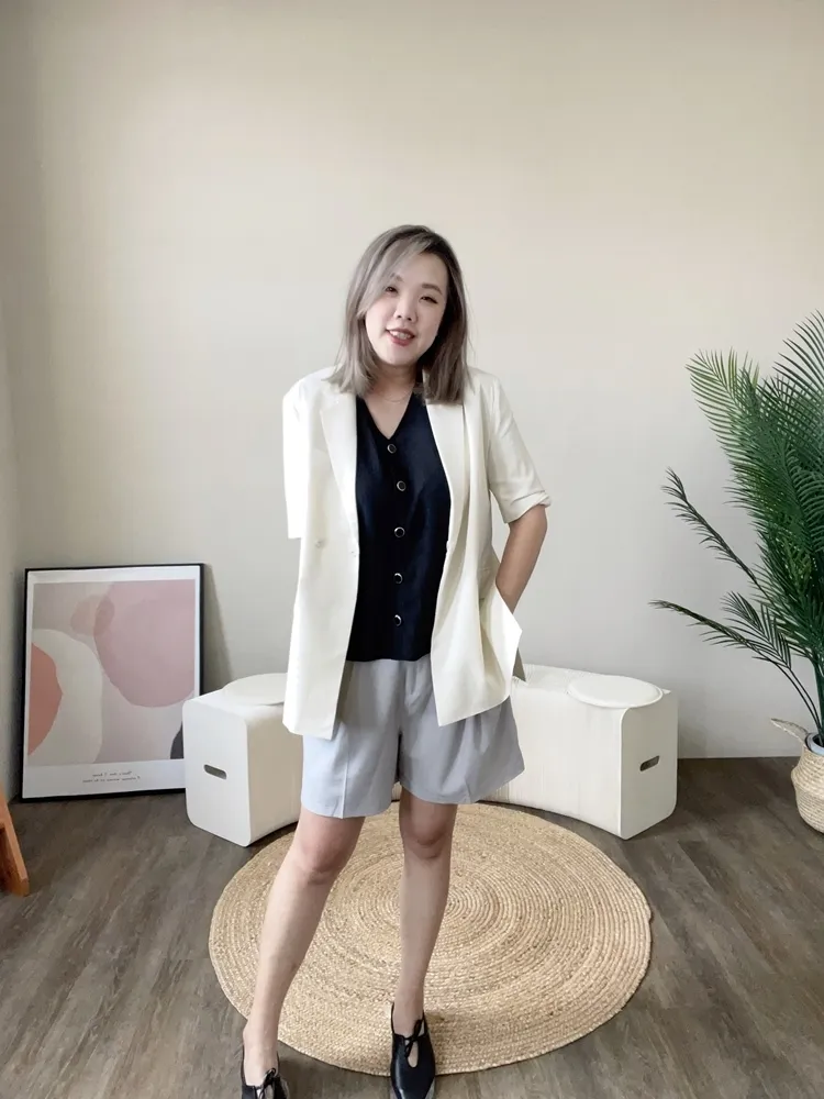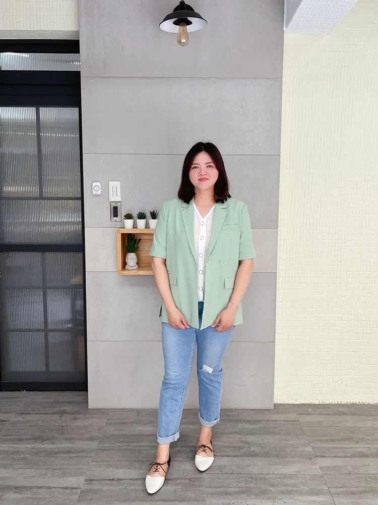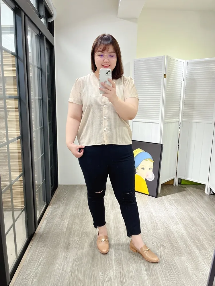 ✓ V領襯衫修飾脖子圓臉感,加上花邊領多了一分可愛感