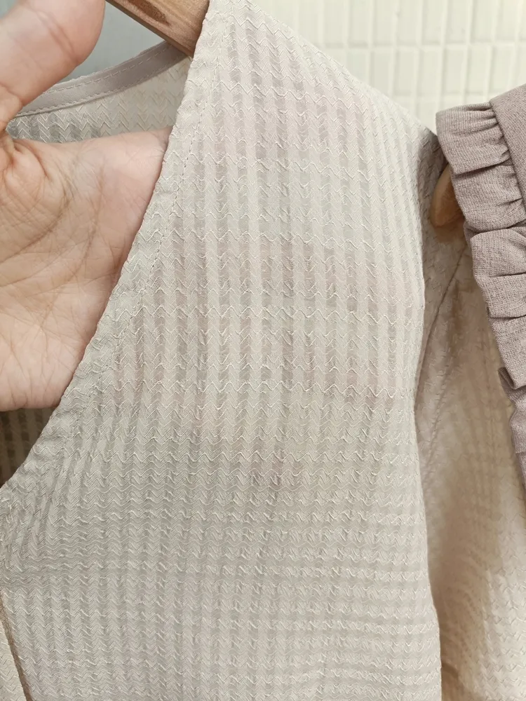✓ 材質是聚酯纖維100%,布料本身有波浪紋+深淺的直條紋,視覺上會有小格紋的錯覺感,手感也可以摸出紋路的凹凸感