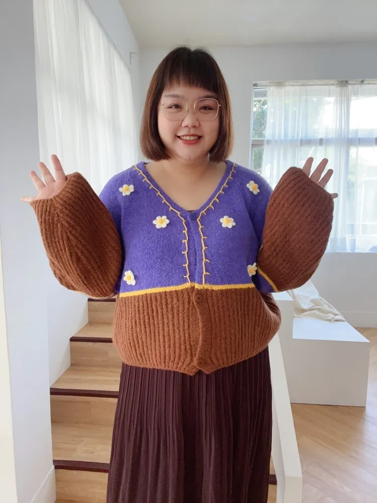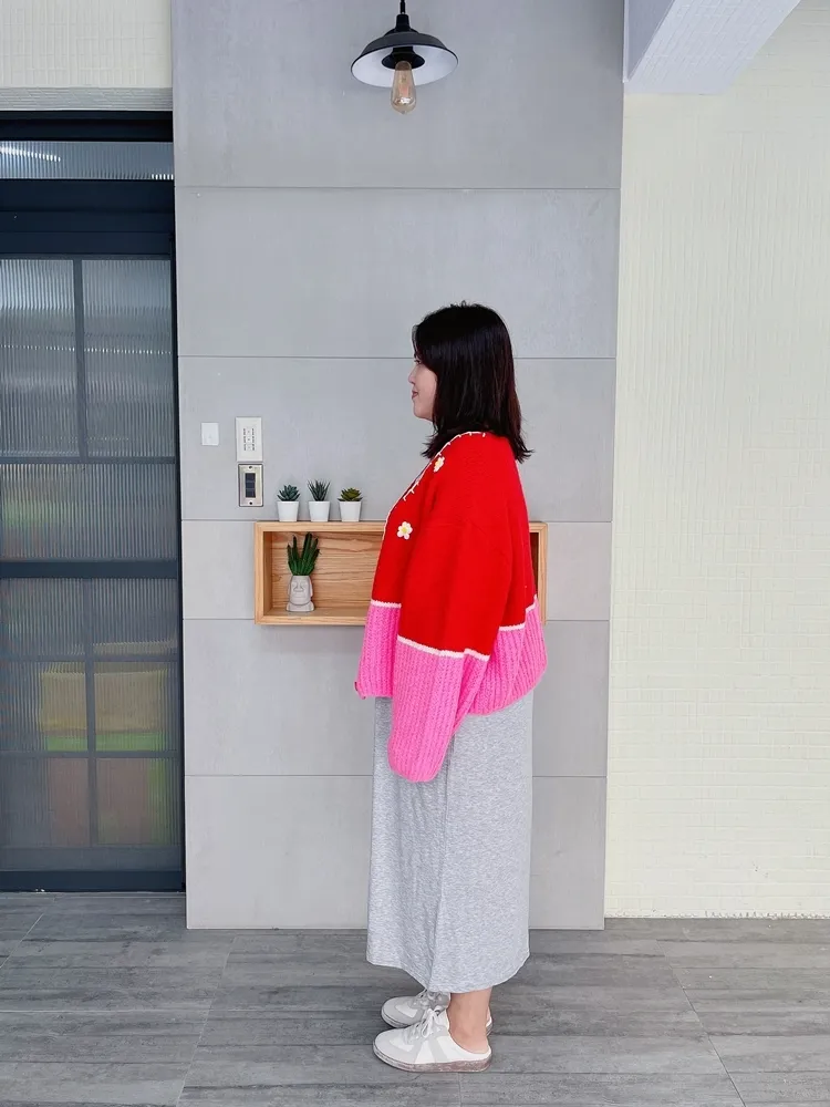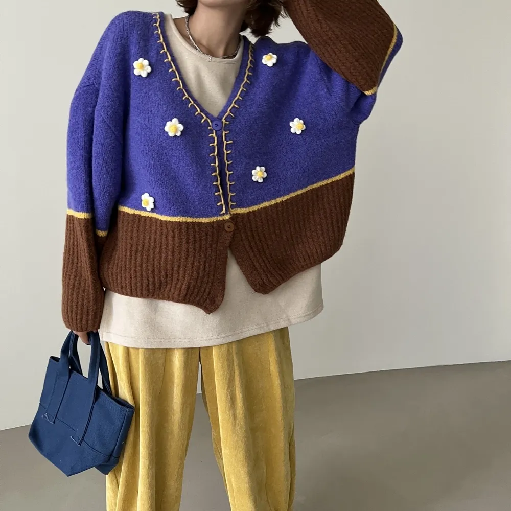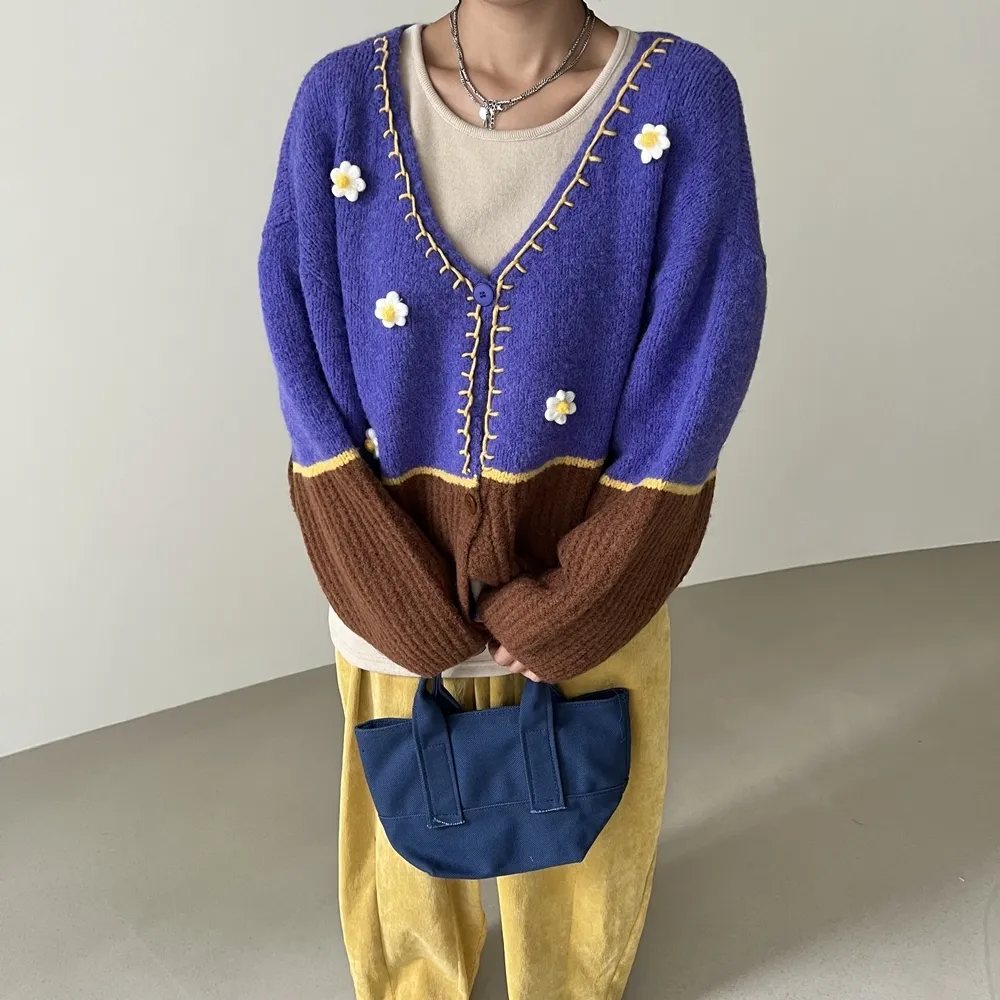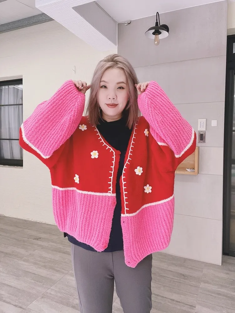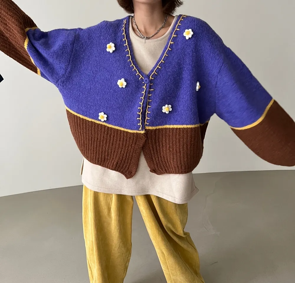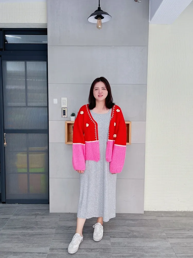 ✓ 立體小花圖案,跳色拼色、毛線縫線設計