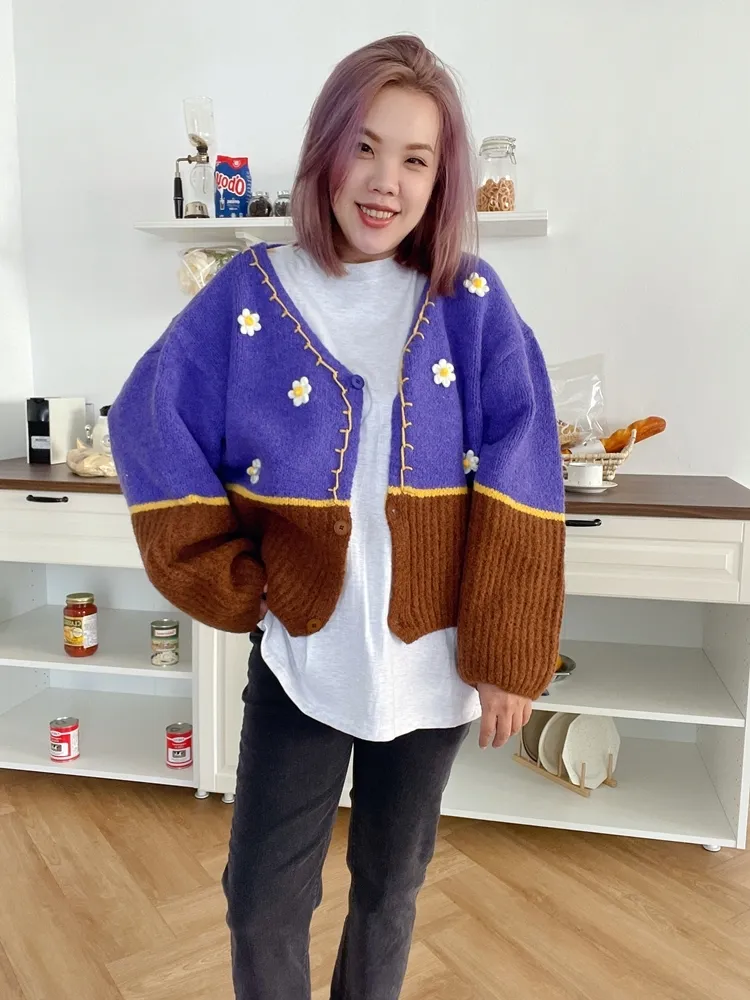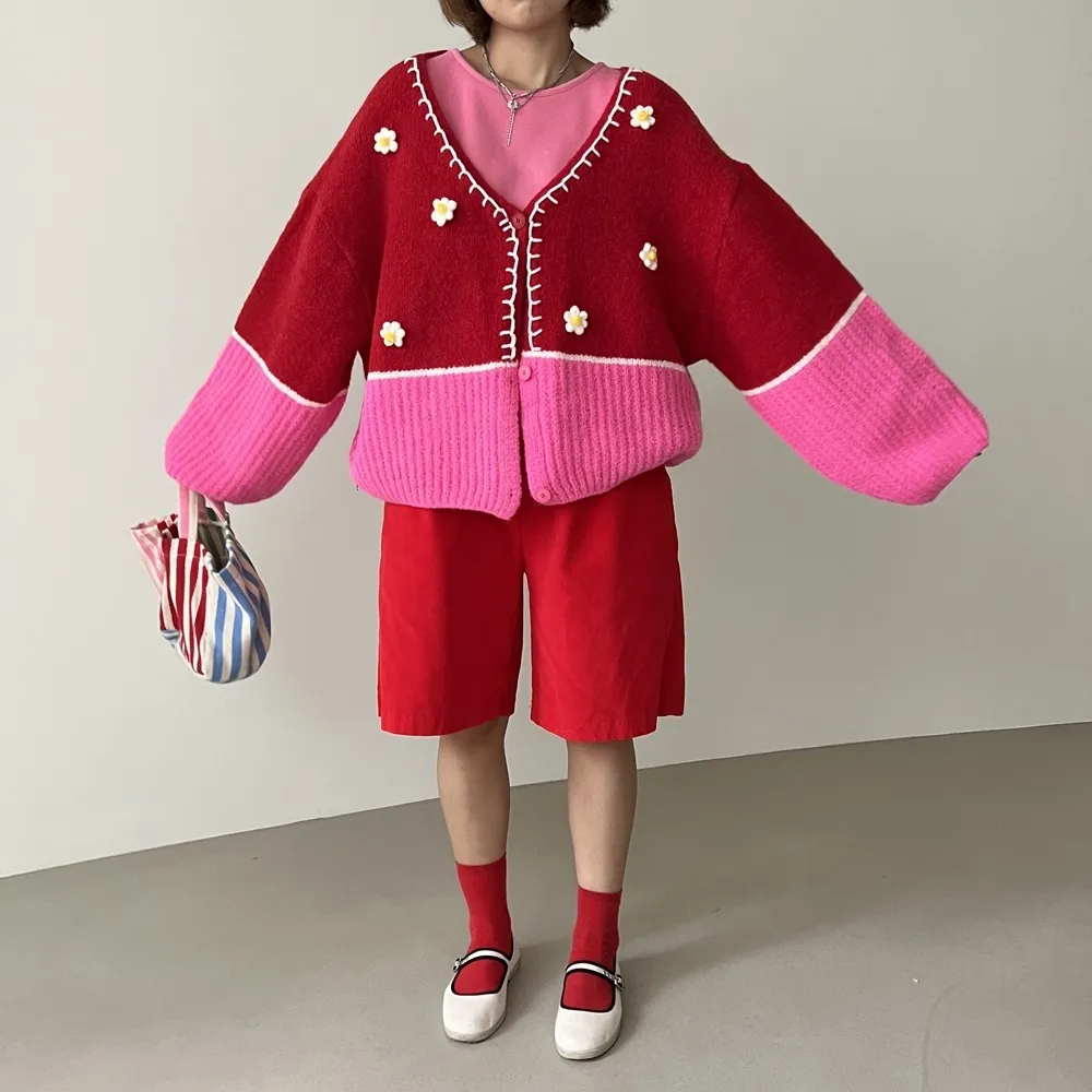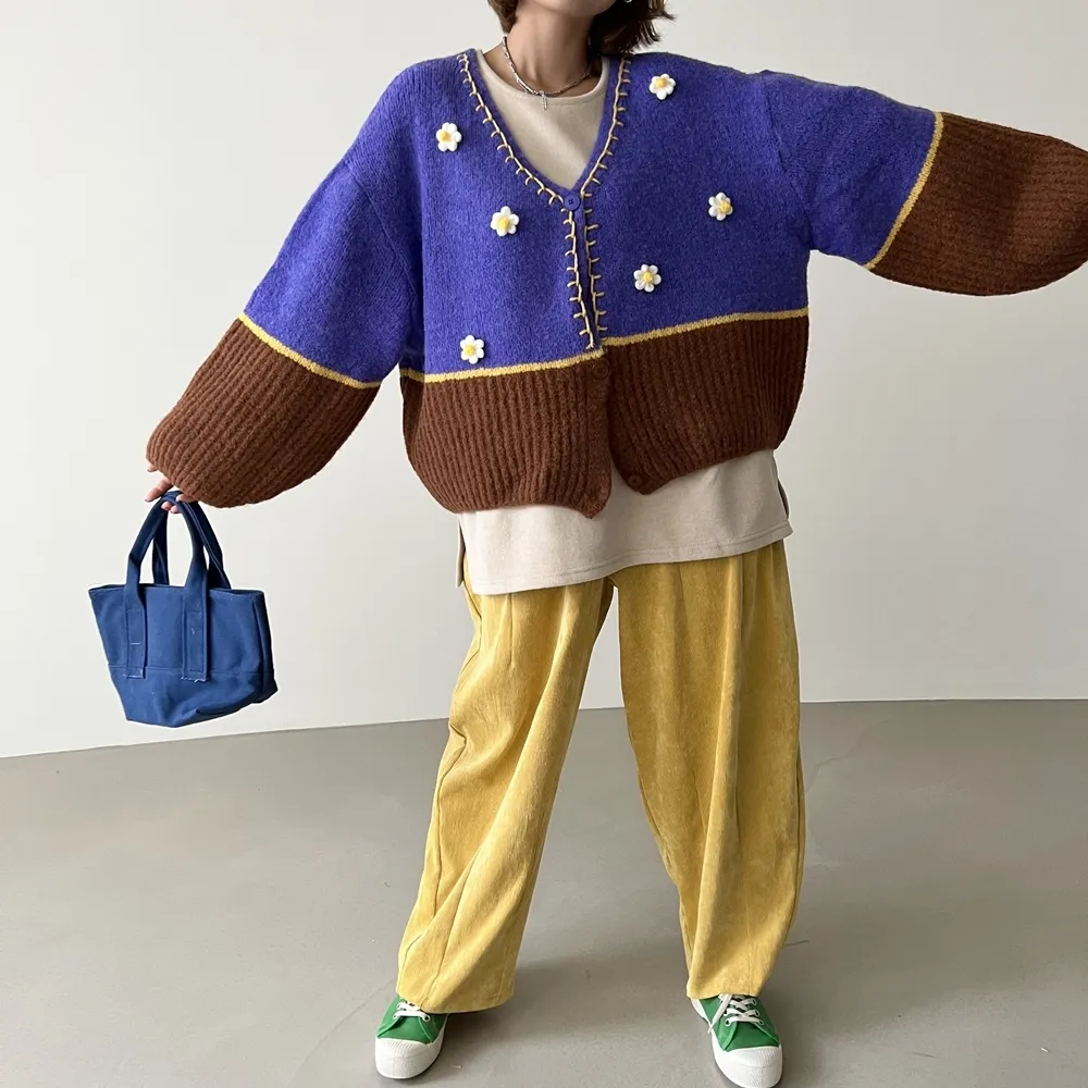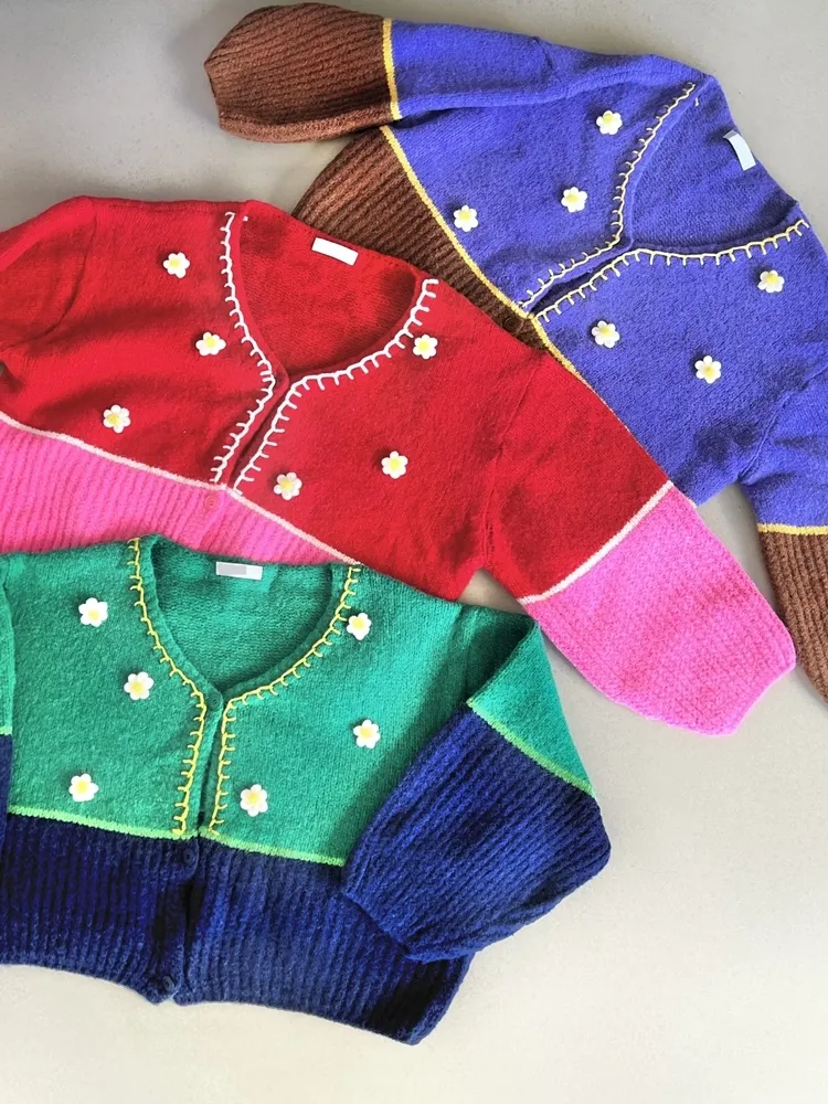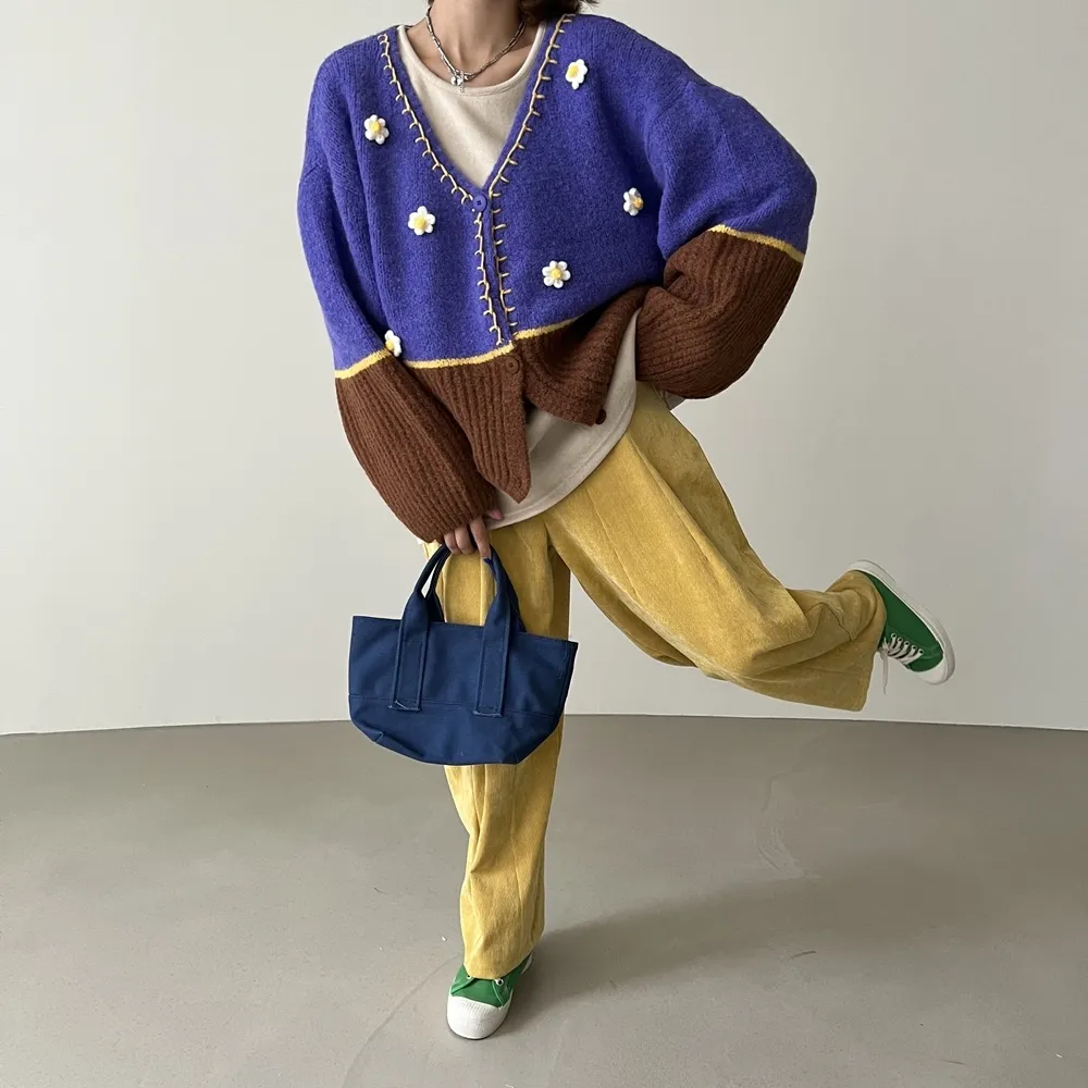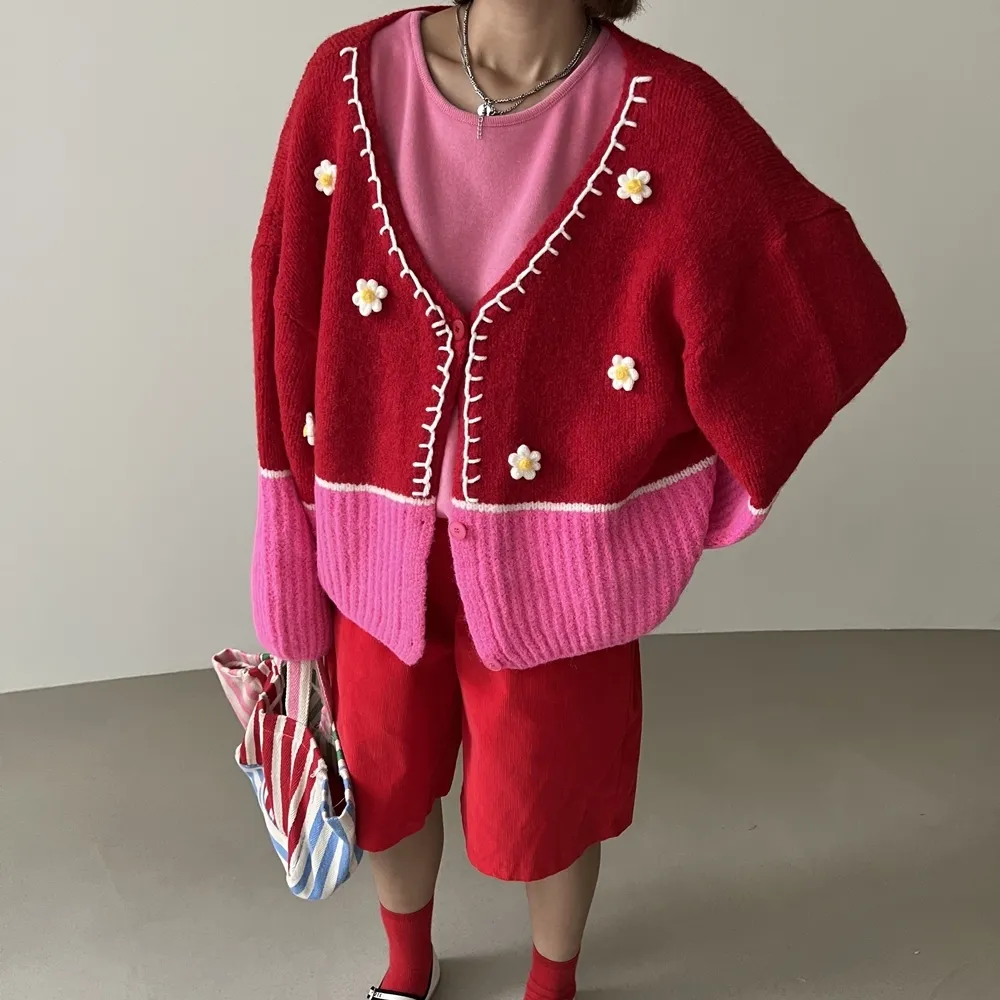 ✓ 立體小花圖案,跳色拼色、毛線縫線設計