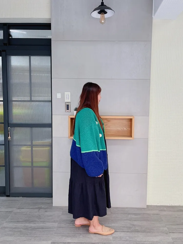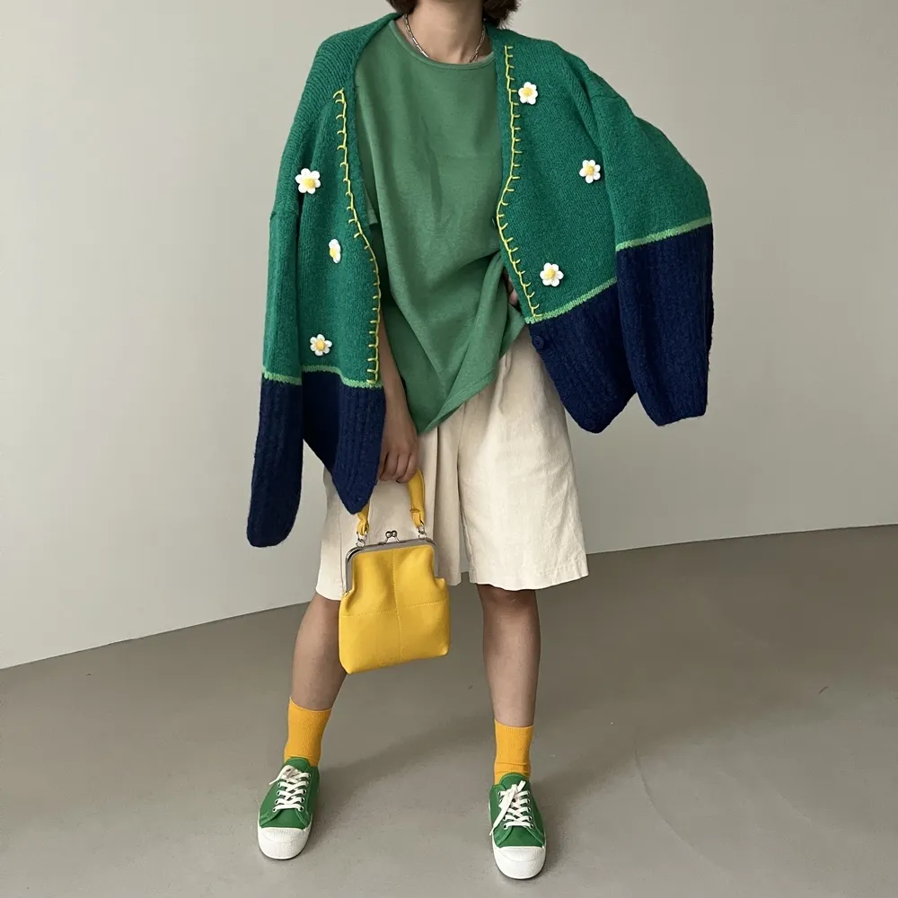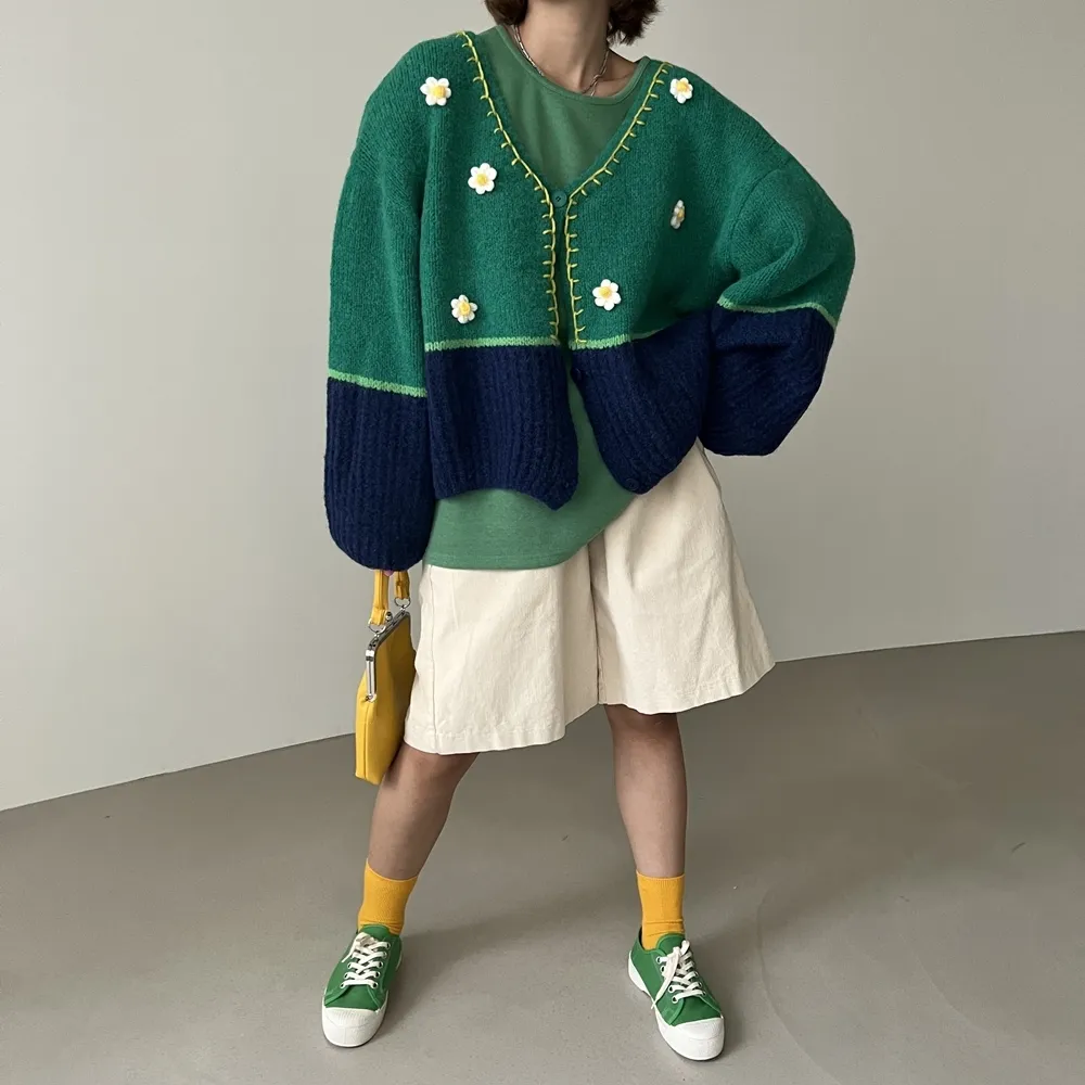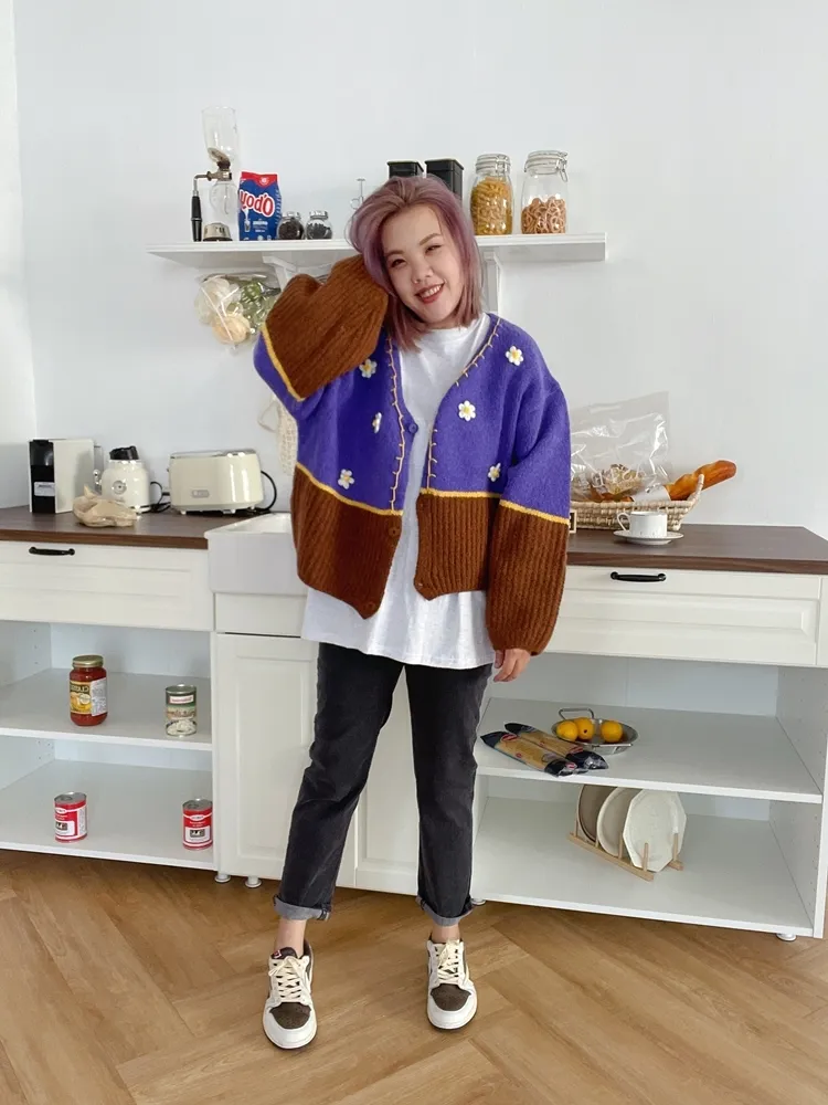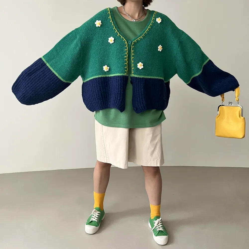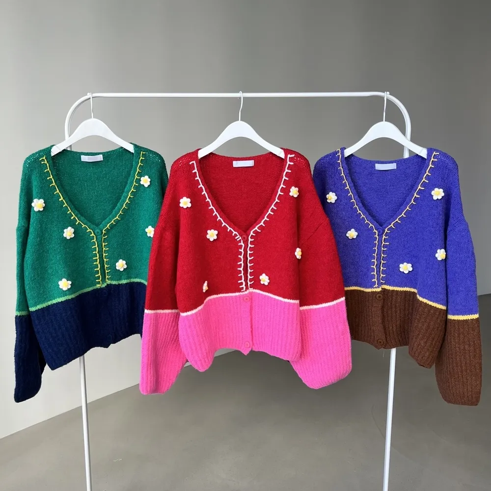 ✓ 立體小花圖案,跳色拼色、毛線縫線設計