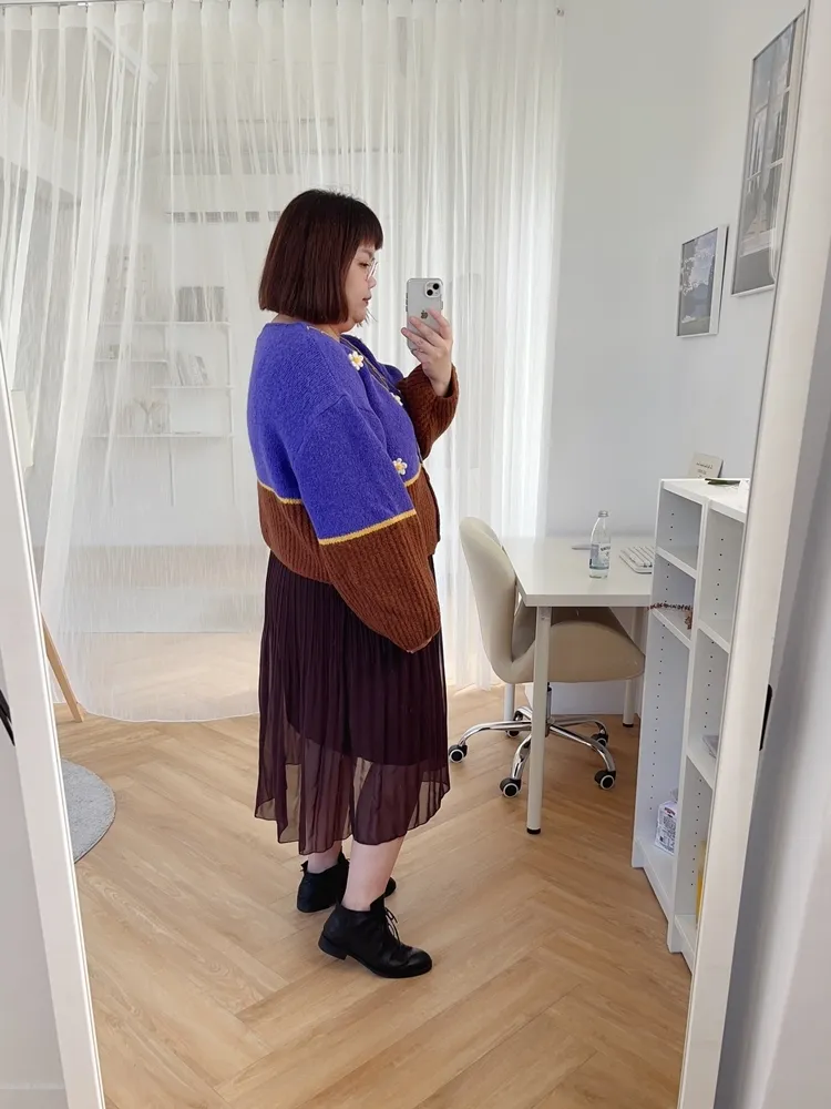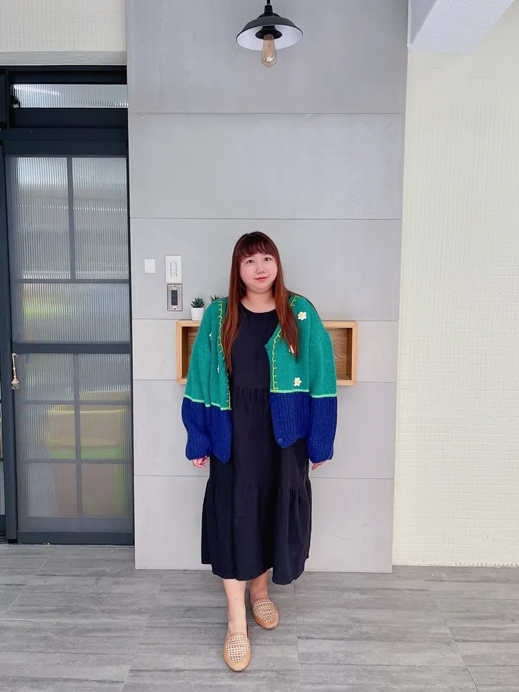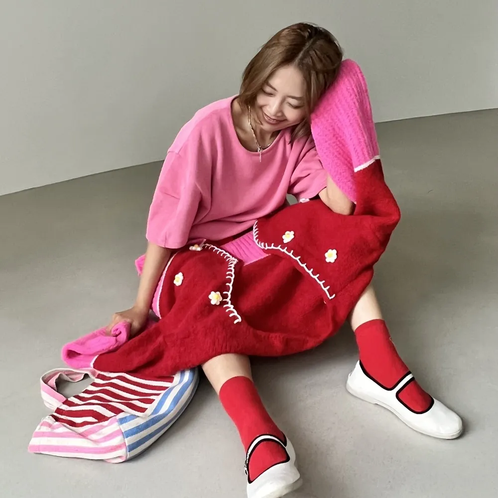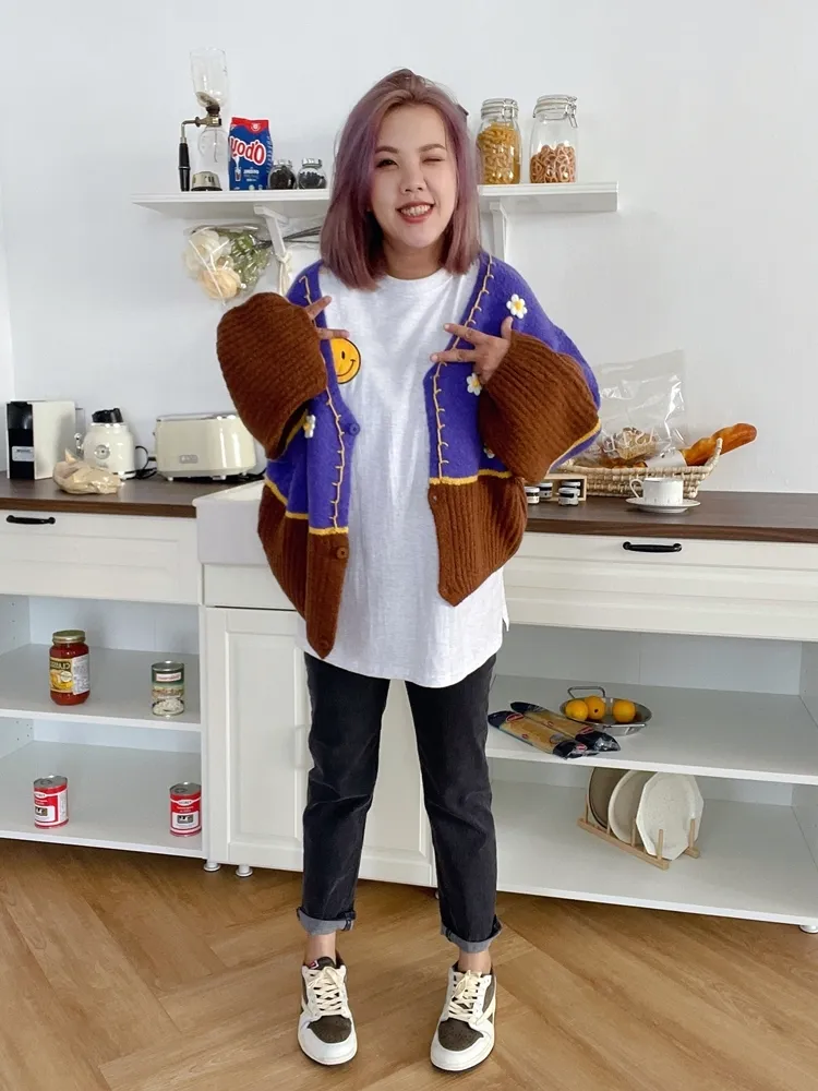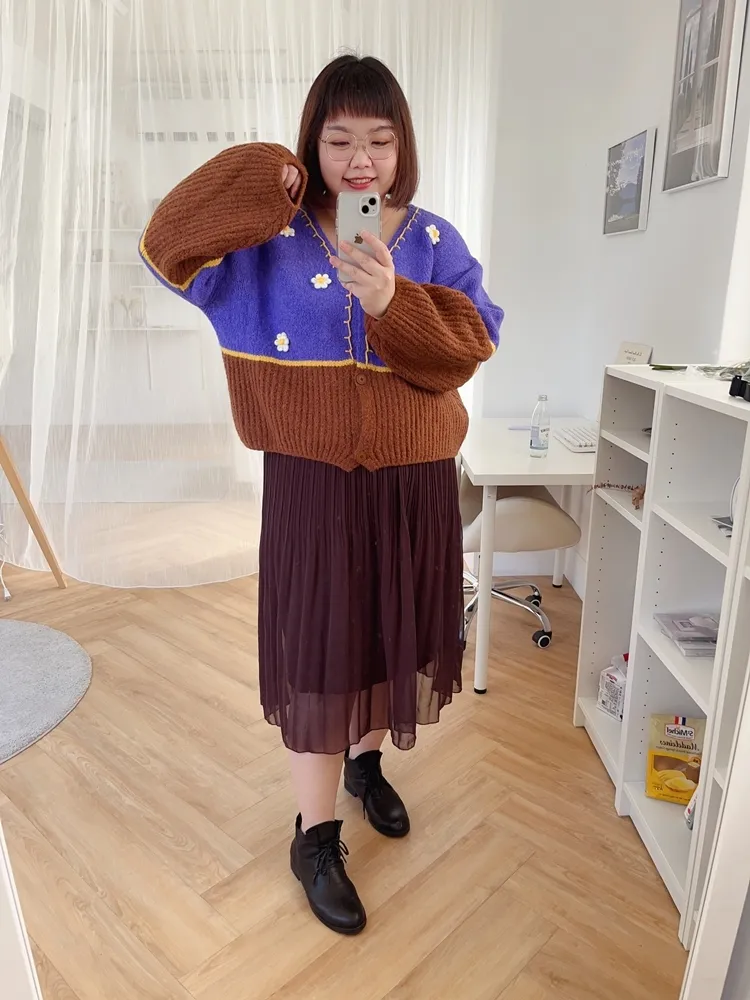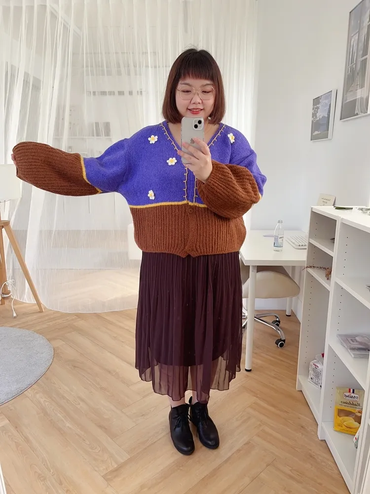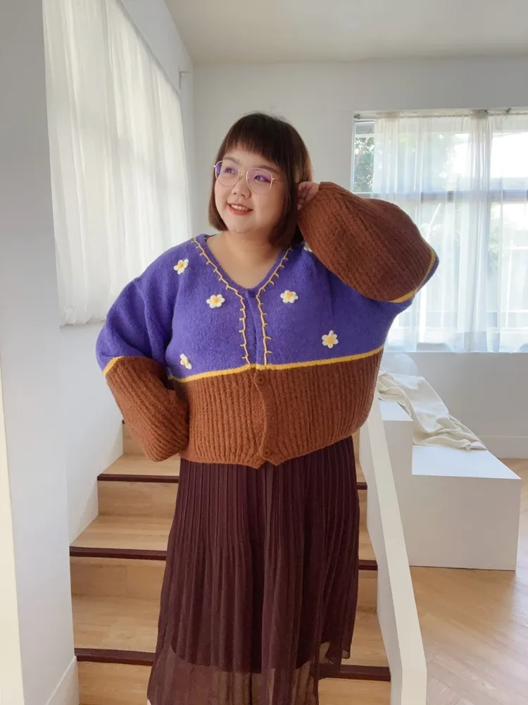 ✓ 立體小花圖案,跳色拼色、毛線縫線設計