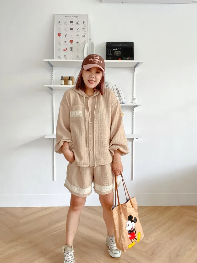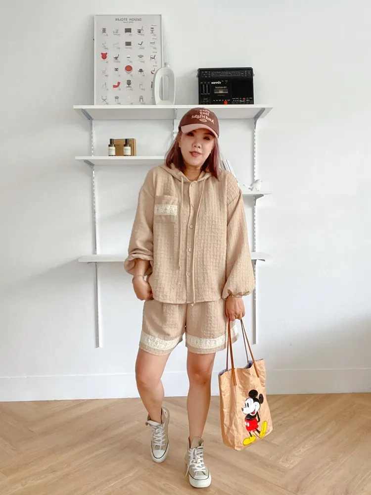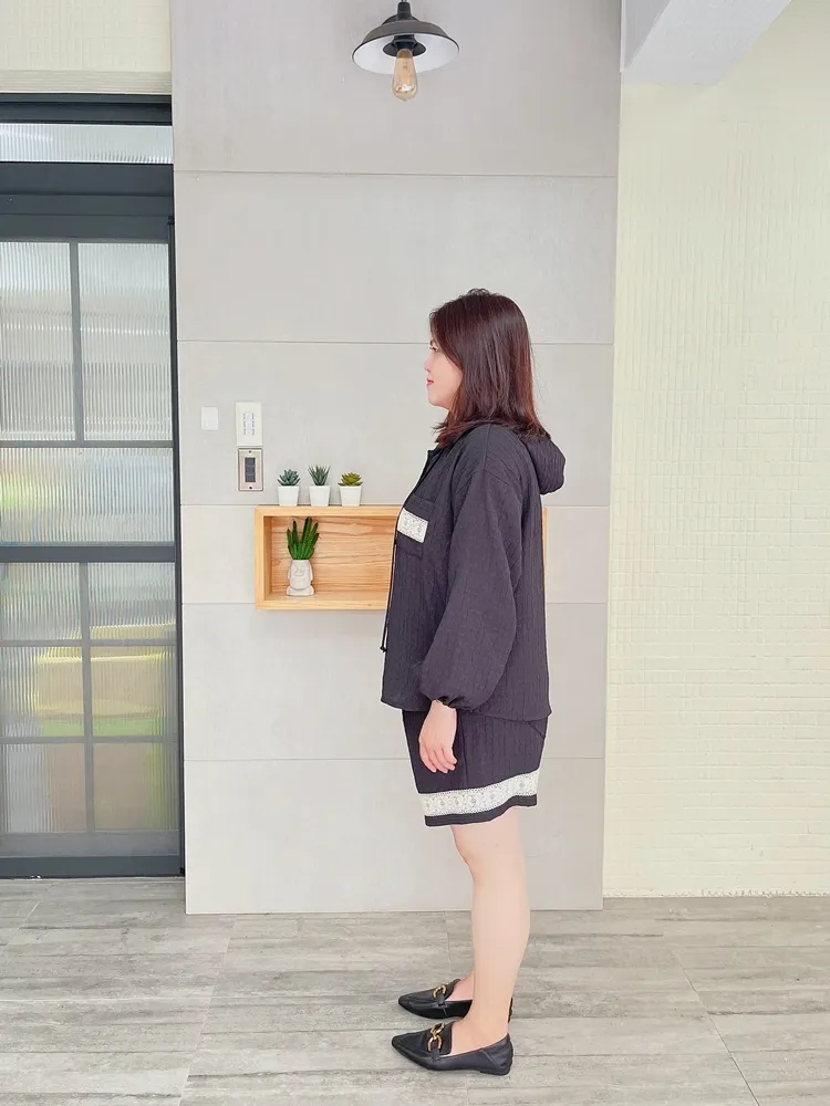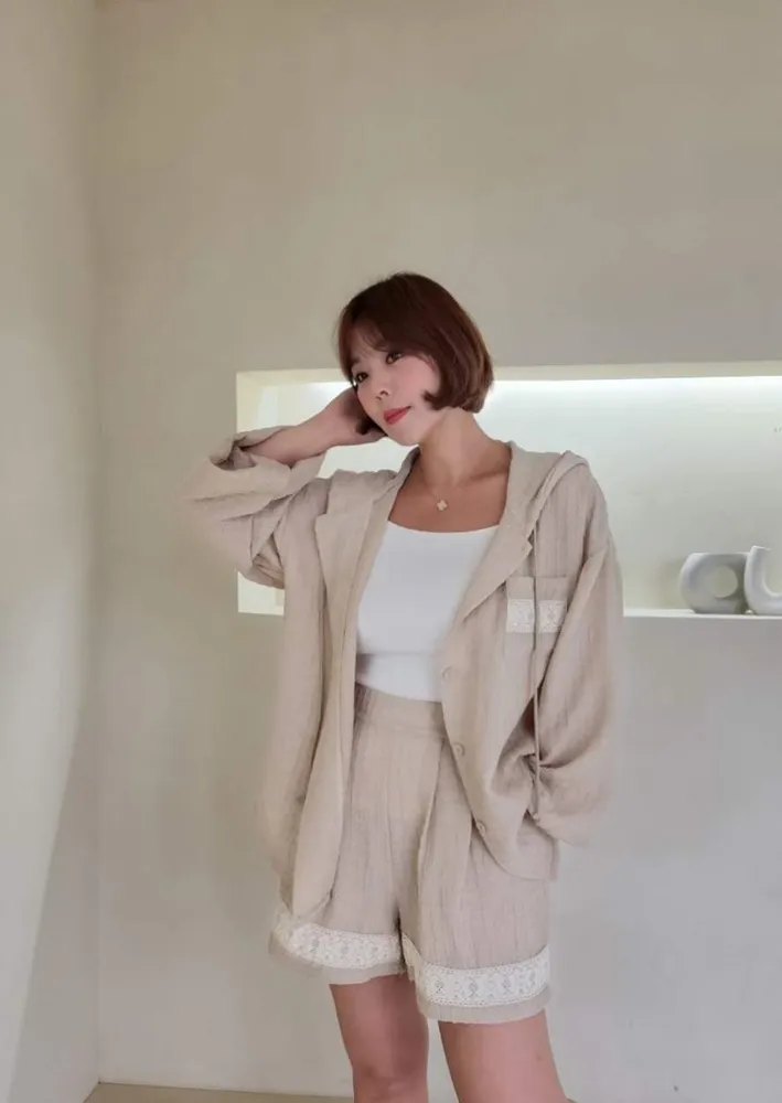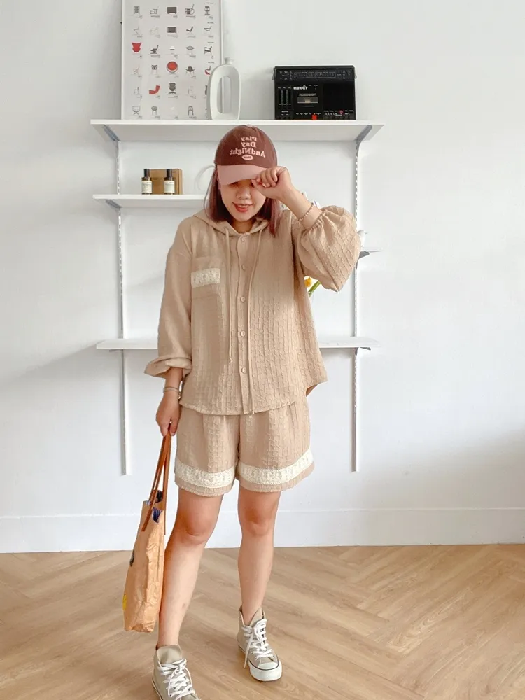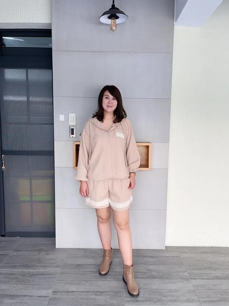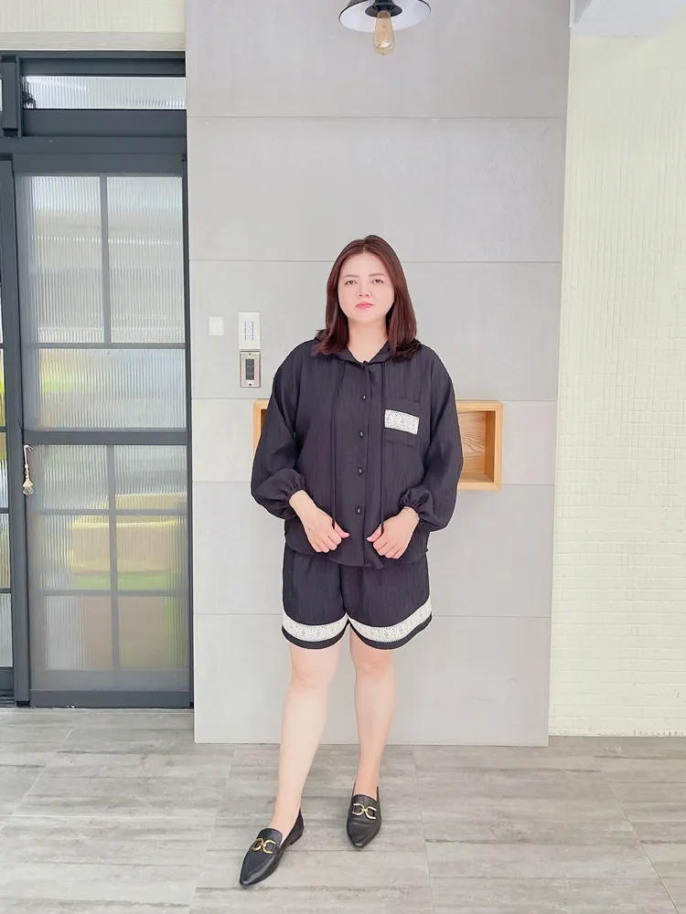 ✓ 襯衫口袋處、褲子褲管處滾蕾絲寬邊,有套裝的一致感