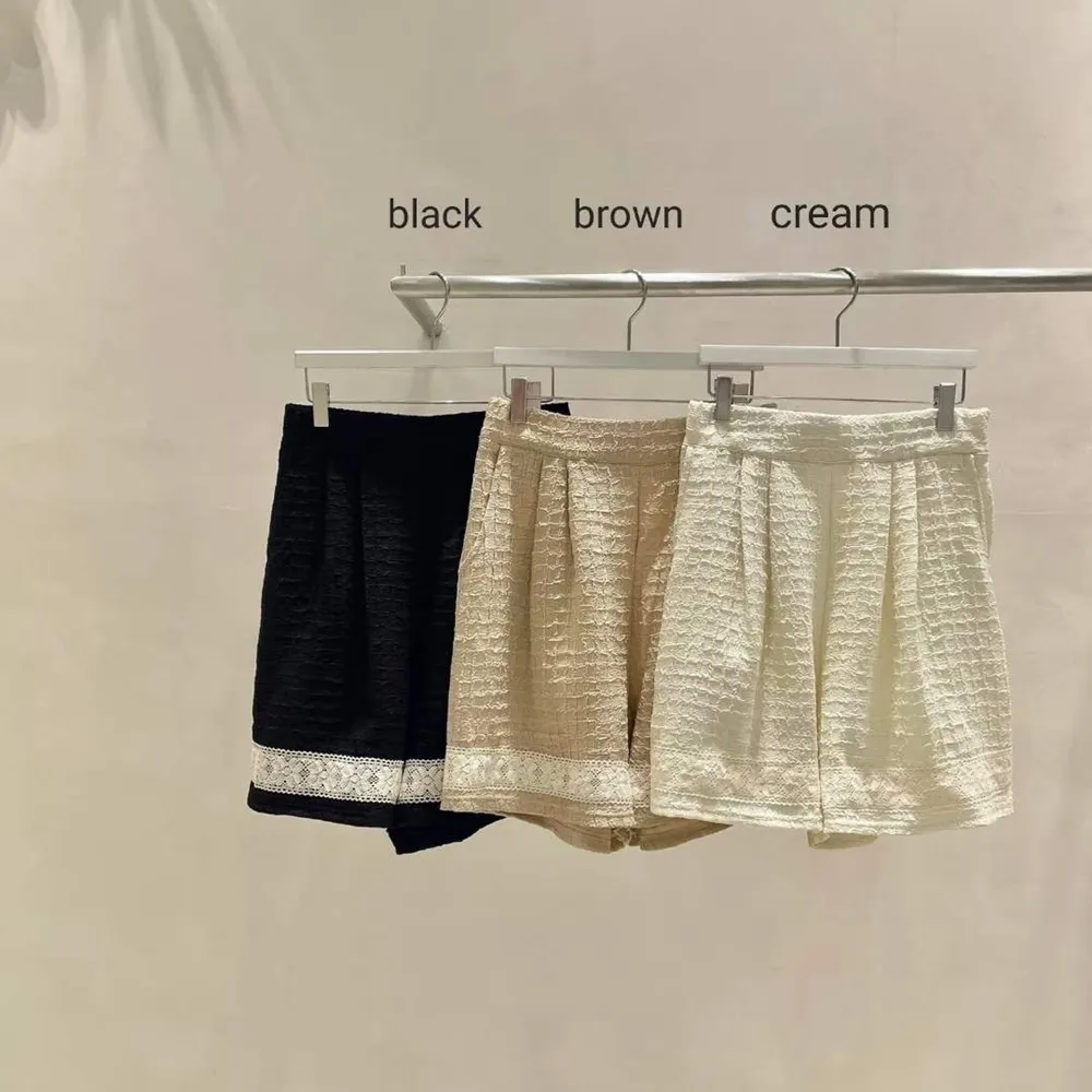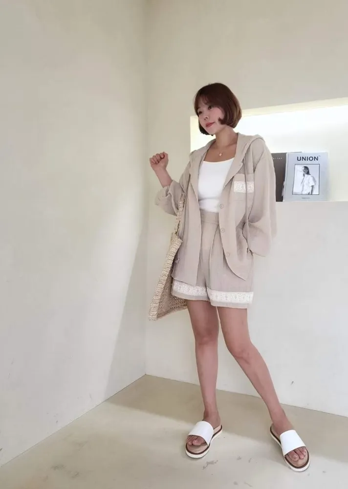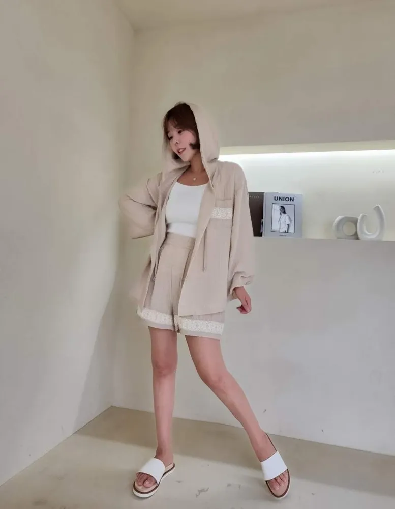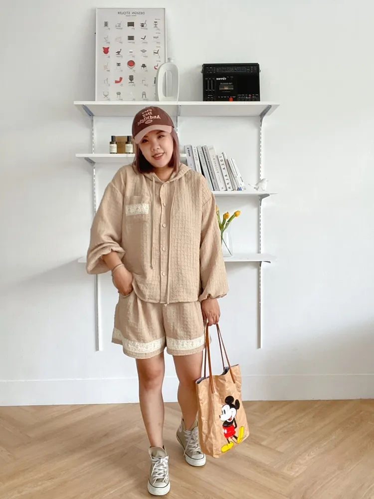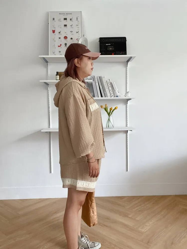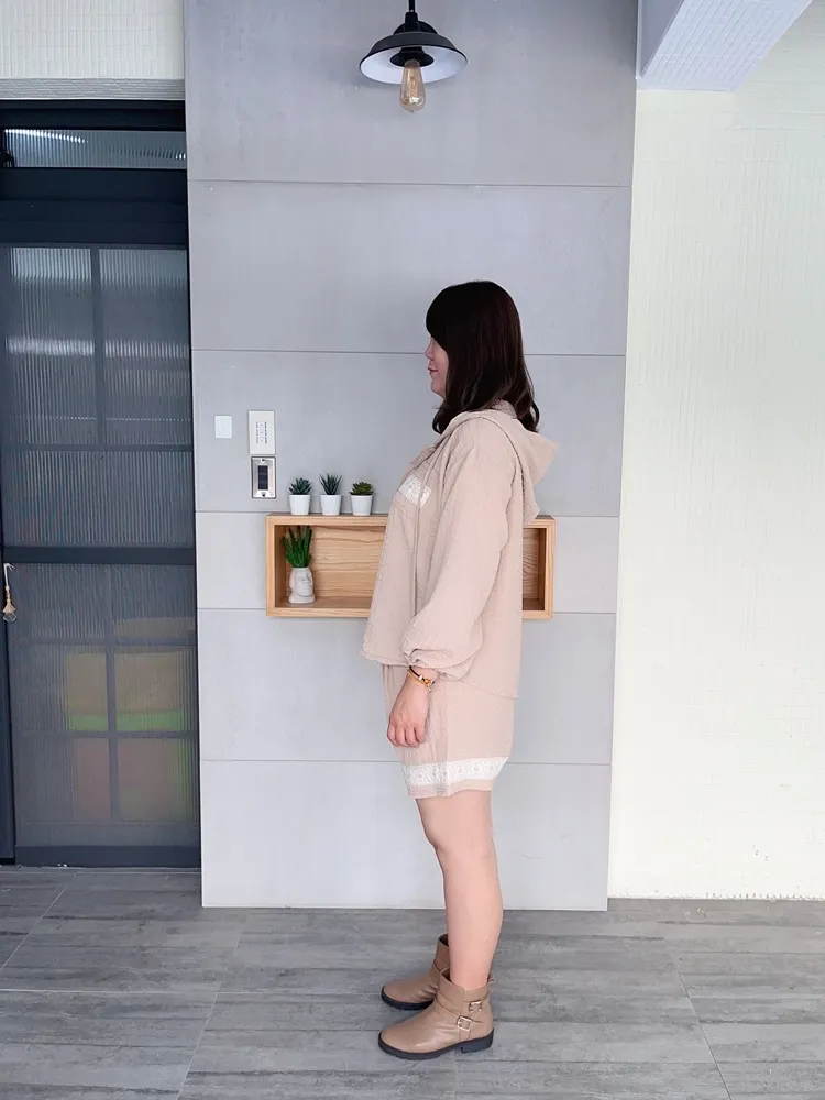 ✓ 襯衫口袋處、褲子褲管處滾蕾絲寬邊,有套裝的一致感