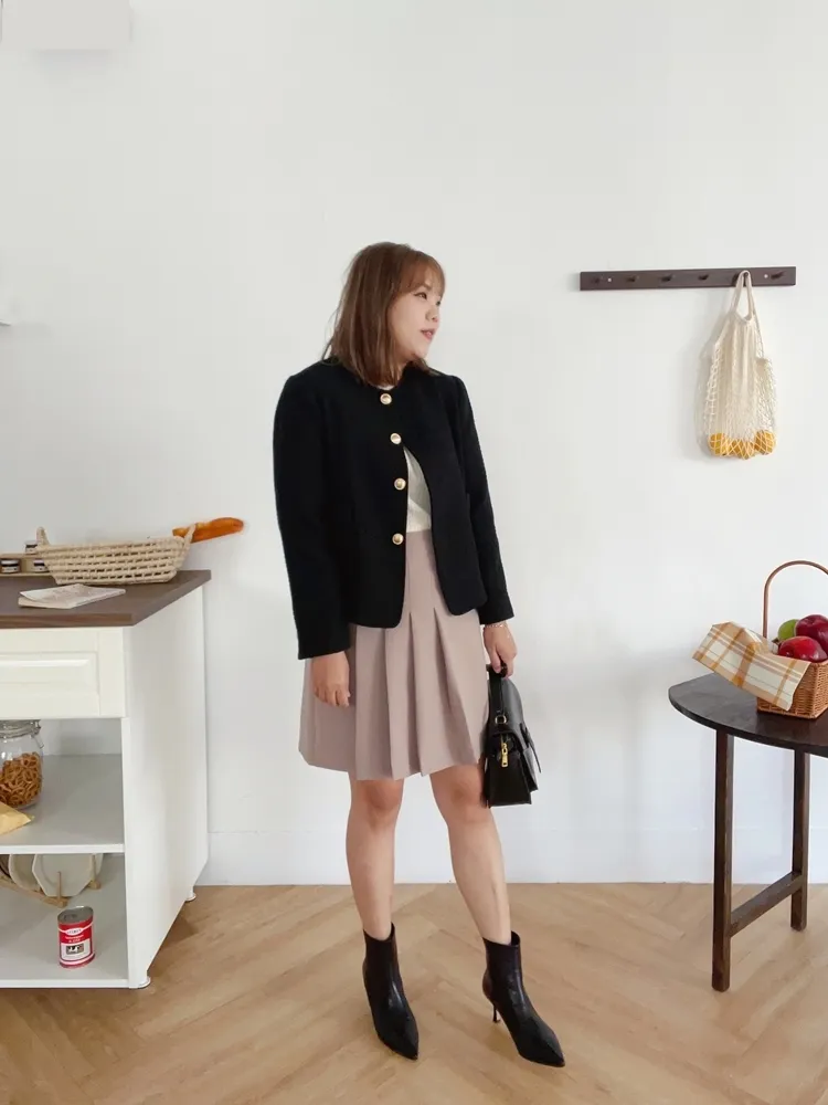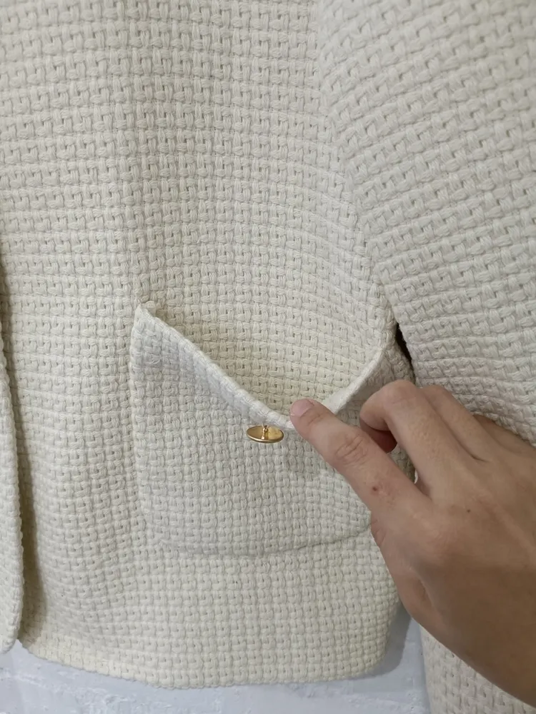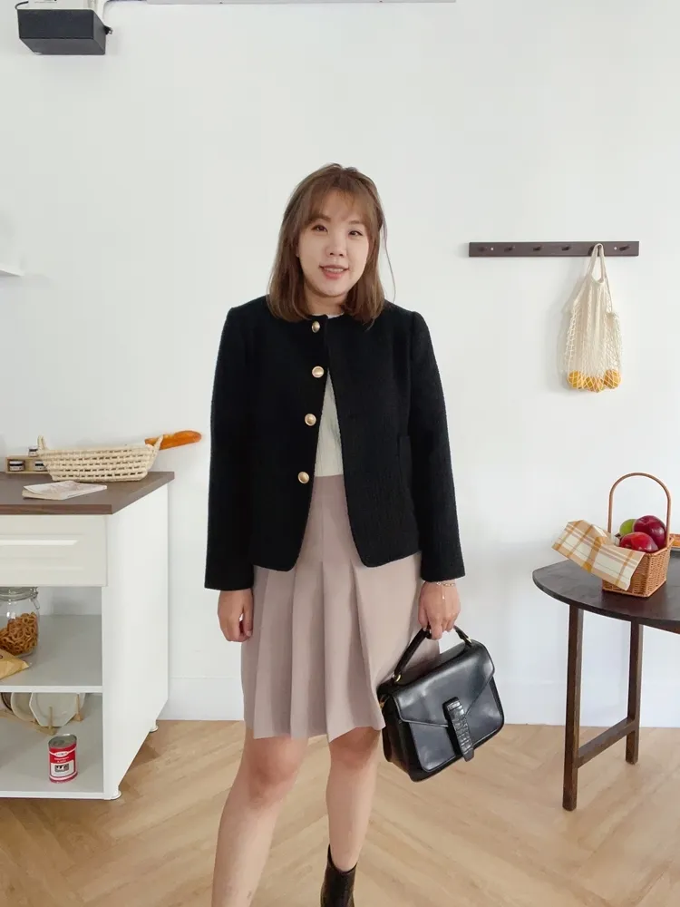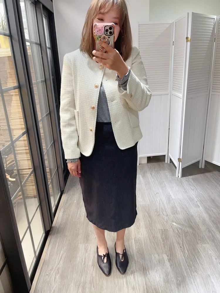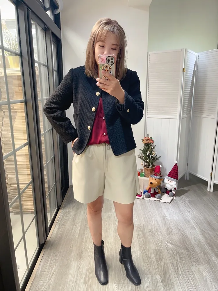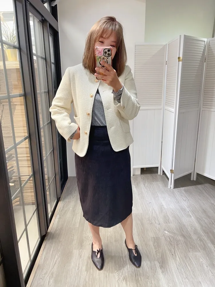 ✓ 混棉,毛線織成的井字紋,布料有厚挺度,適合入冬穿著