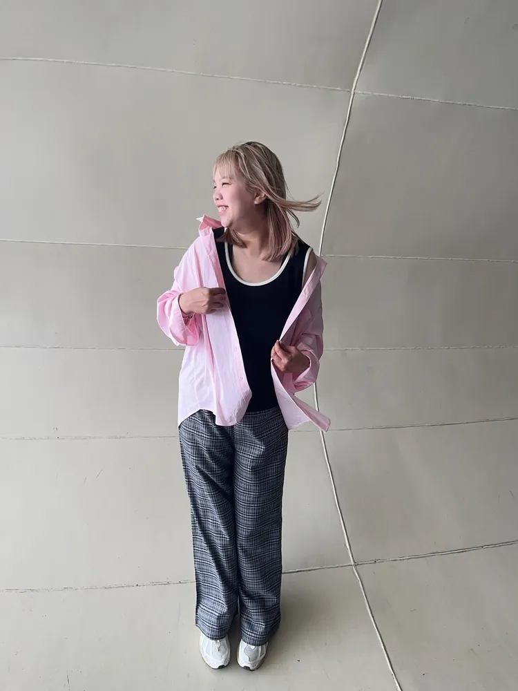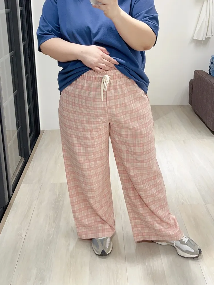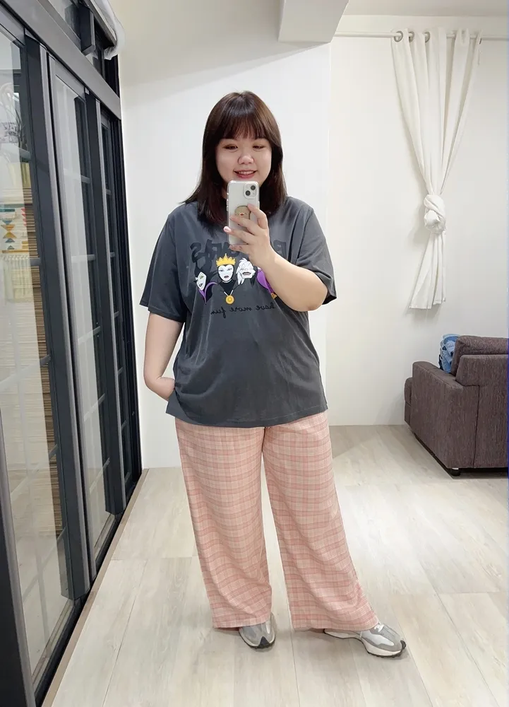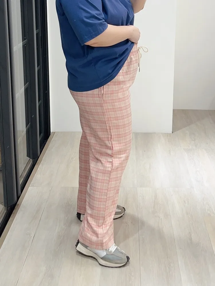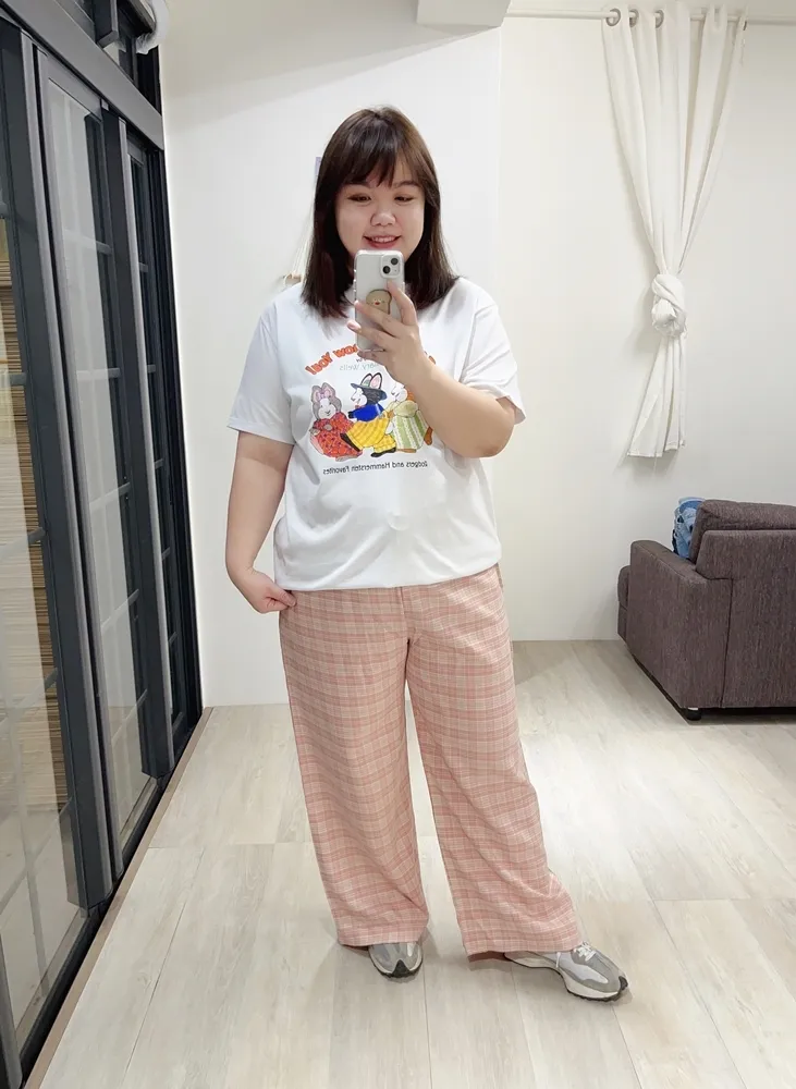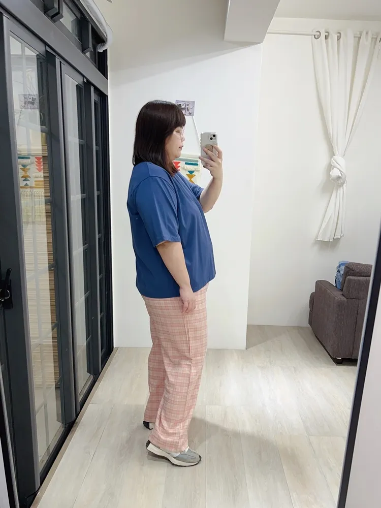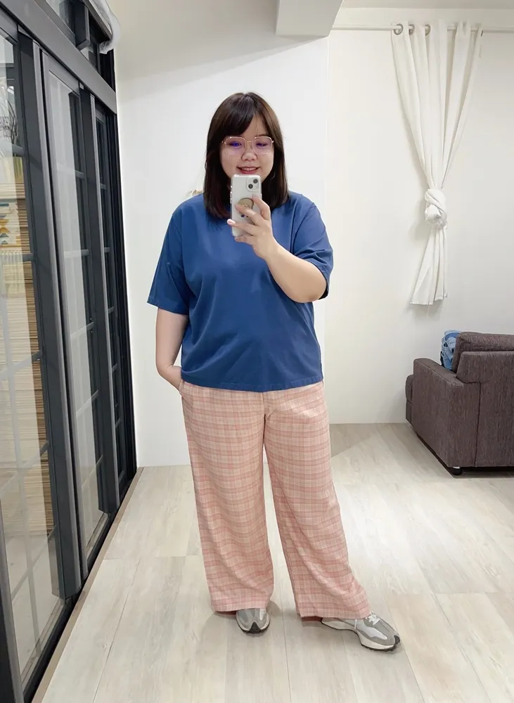 超可愛的粉紅色格紋褲,版型做得很好,穿起來顯腿直又腿長