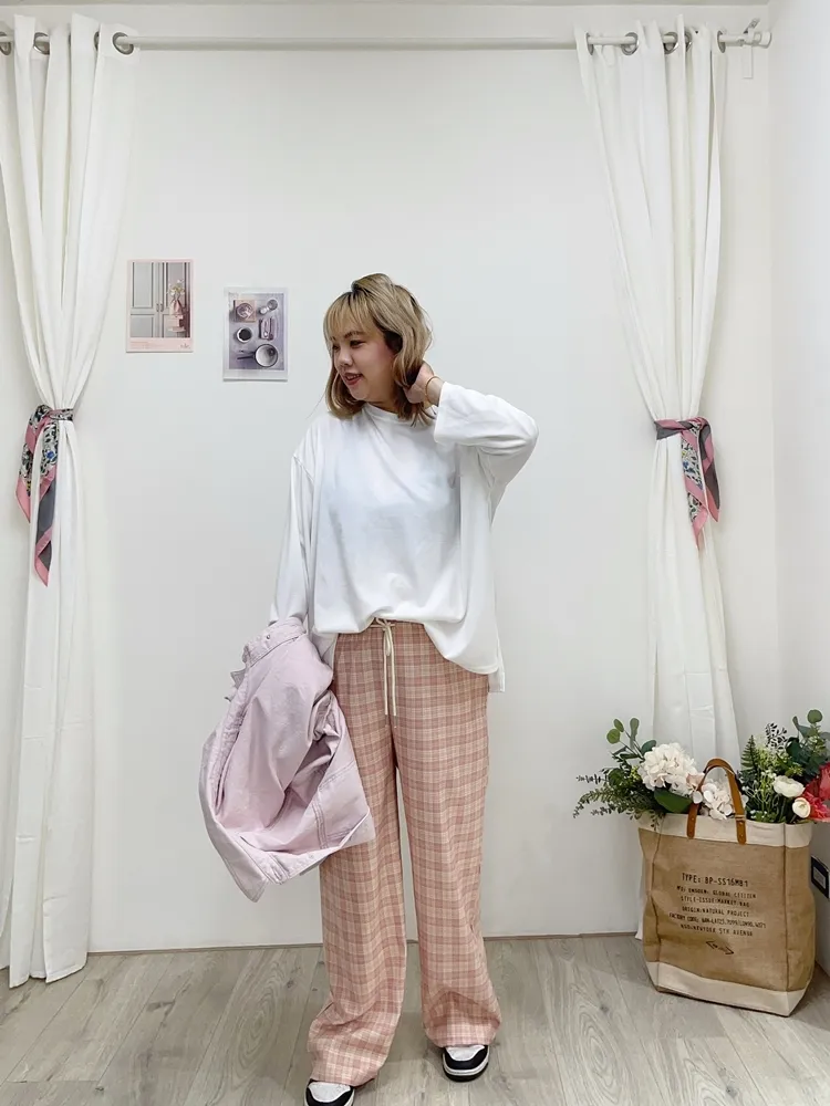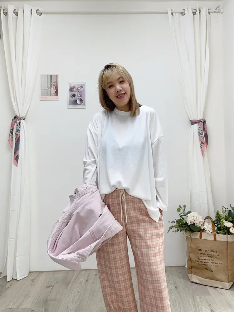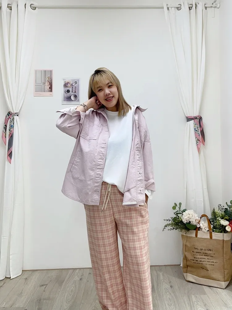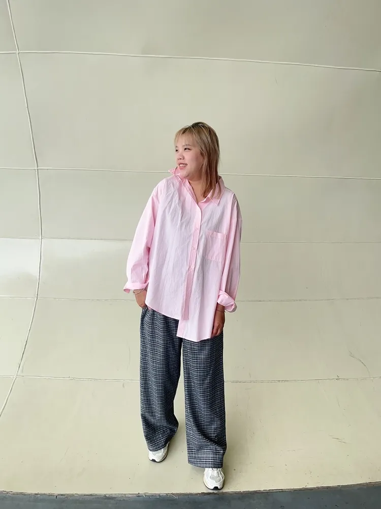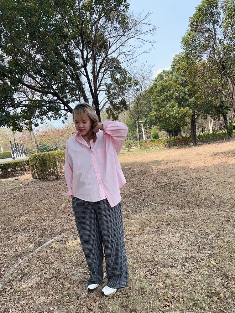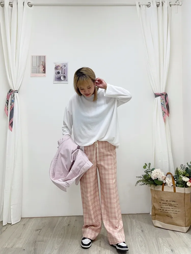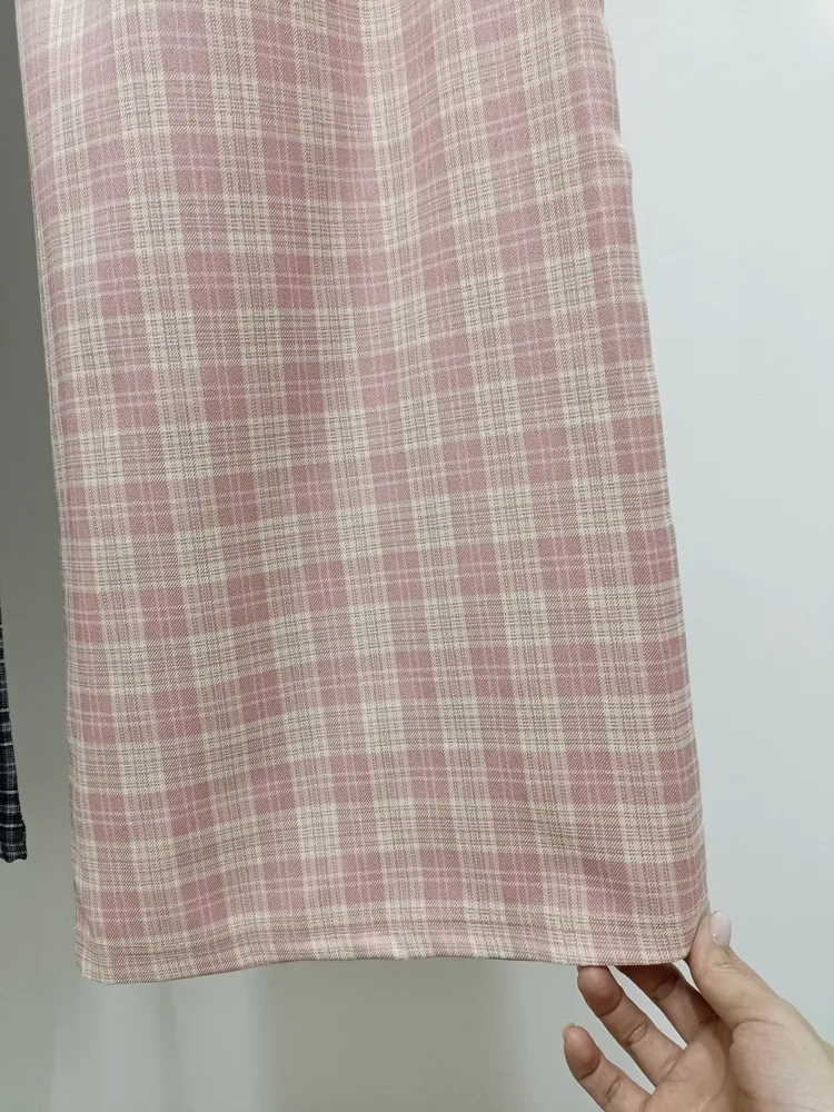 超可愛的粉紅色格紋褲,版型做得很好,穿起來顯腿直又腿長