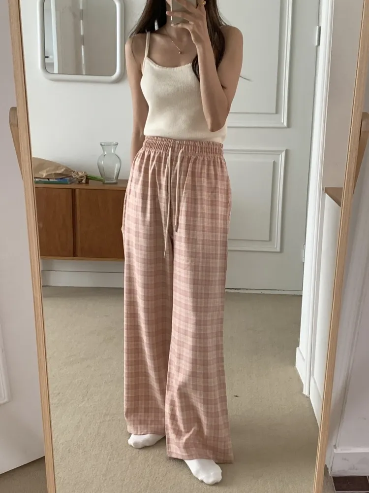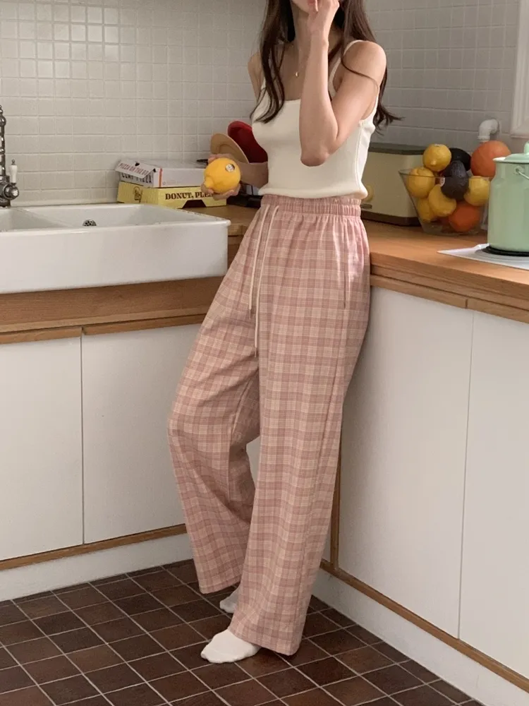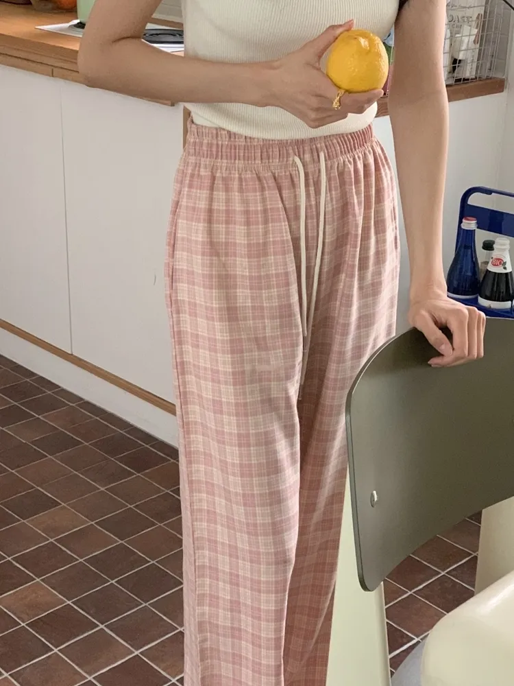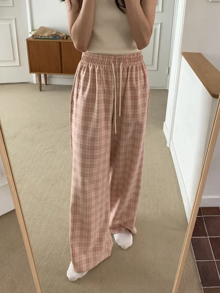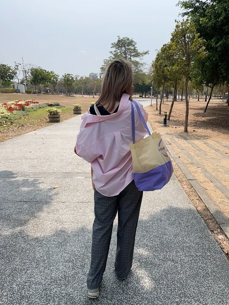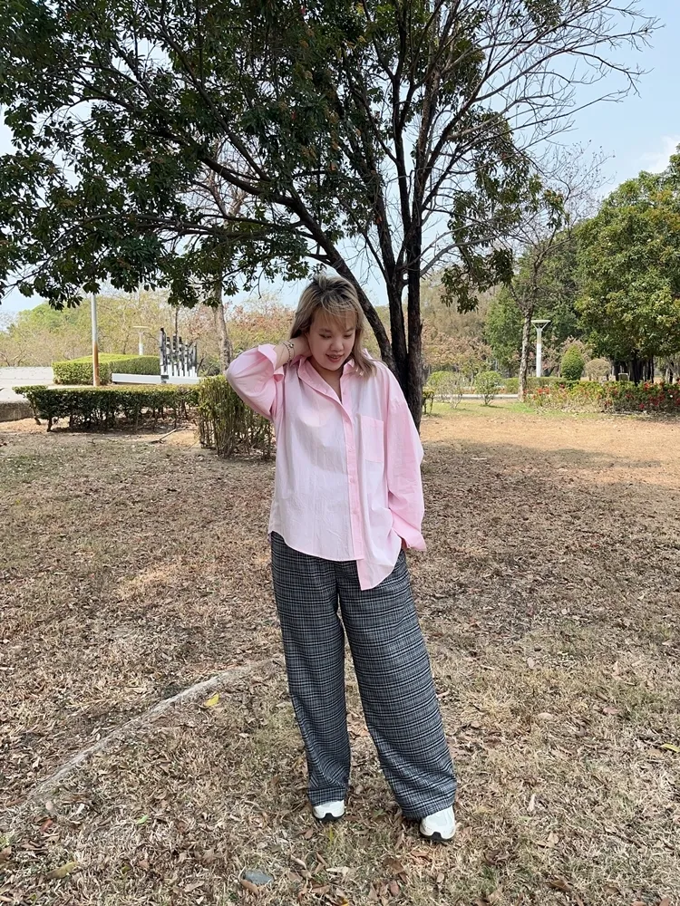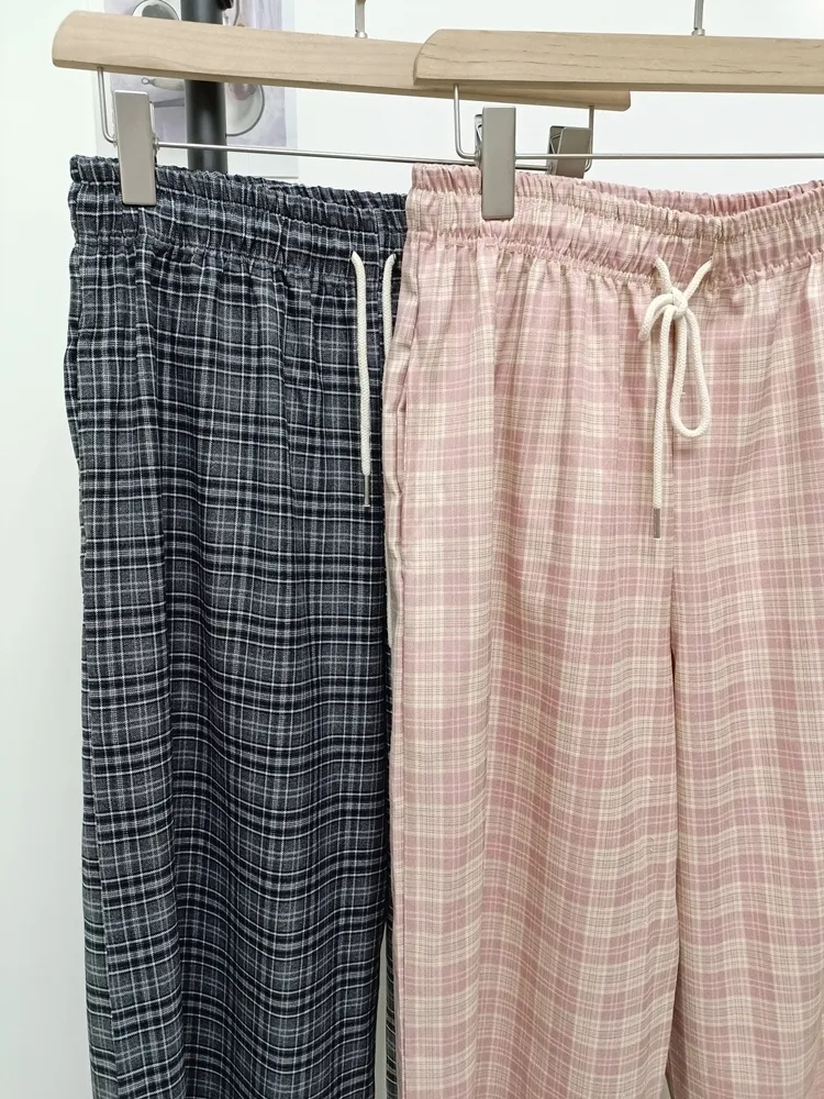 超可愛的粉紅色格紋褲,版型做得很好,穿起來顯腿直又腿長