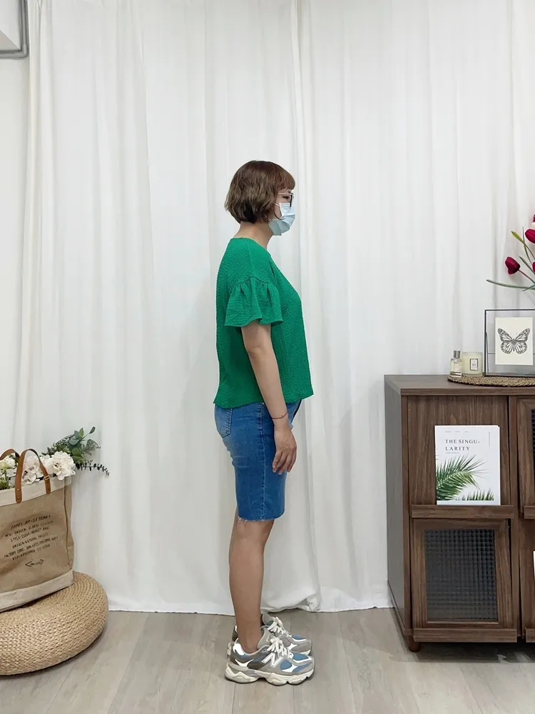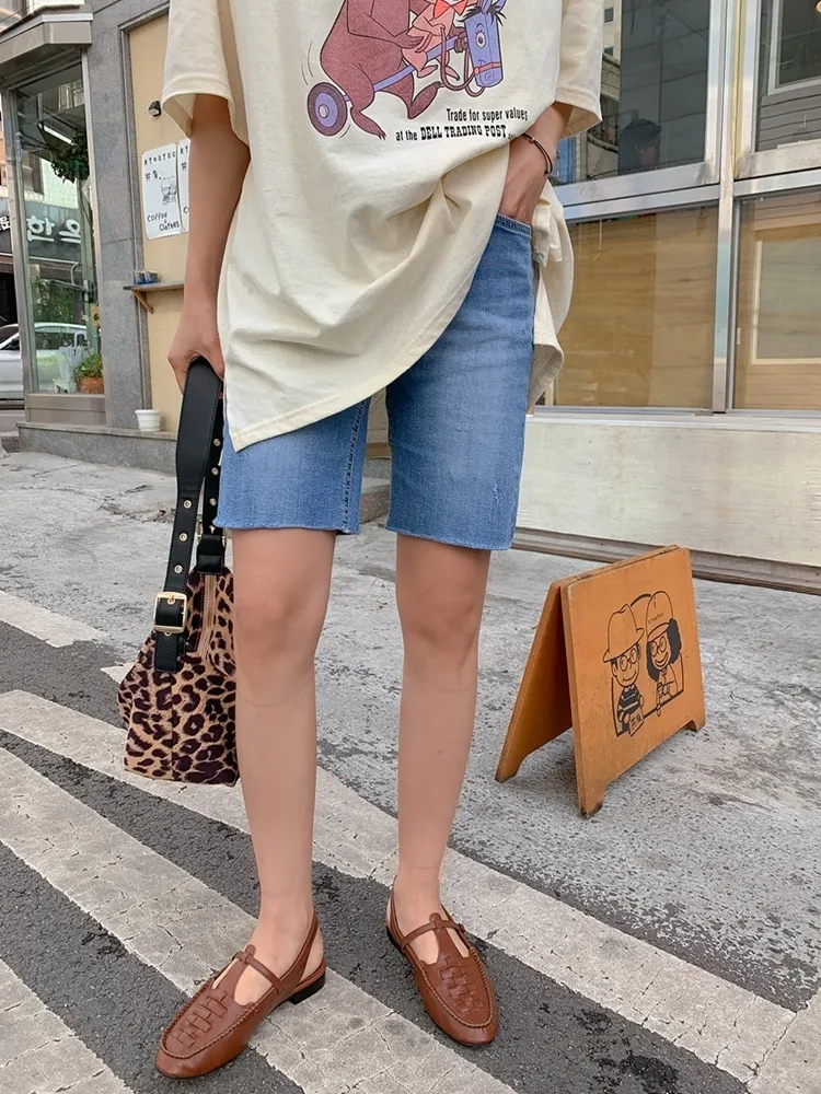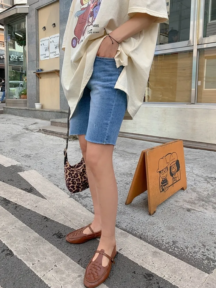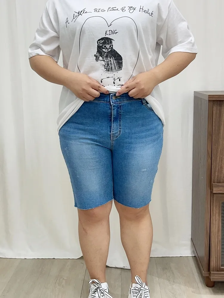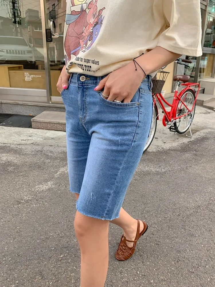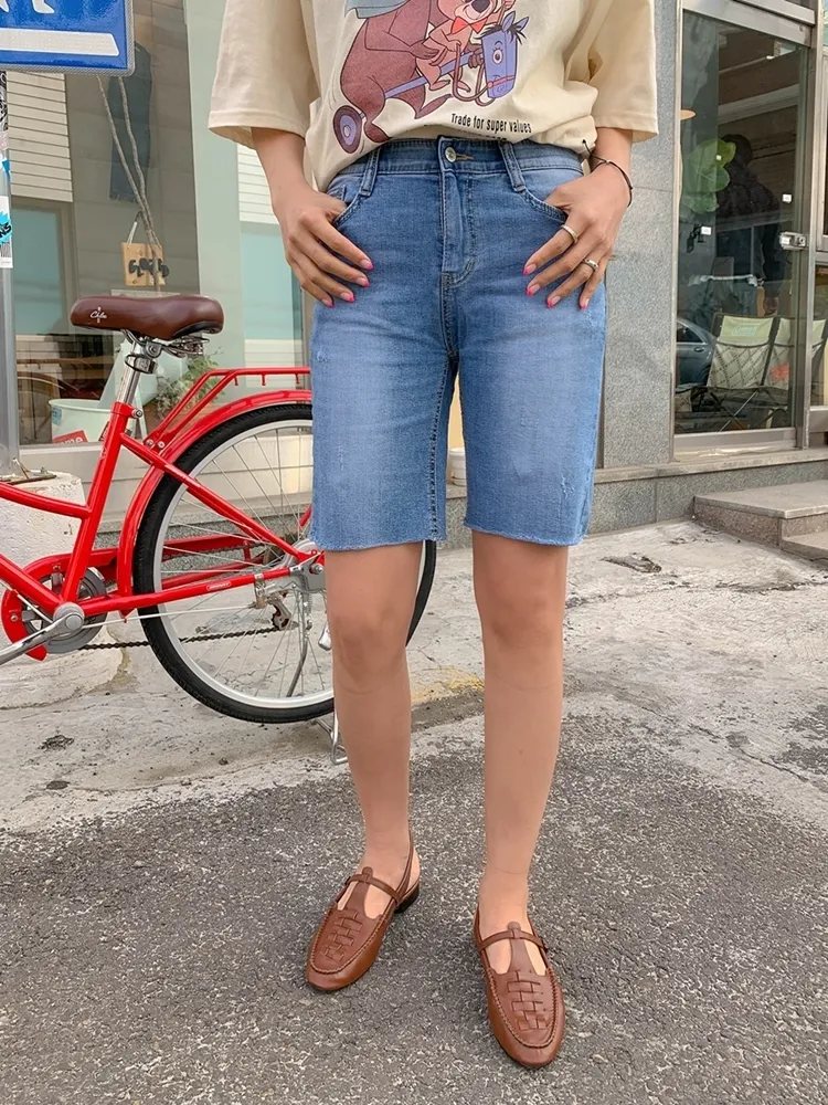 ✓ 五分長牛仔褲,褲管幾處些微刷破設計