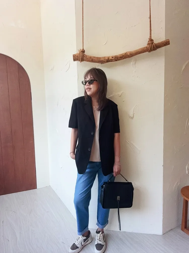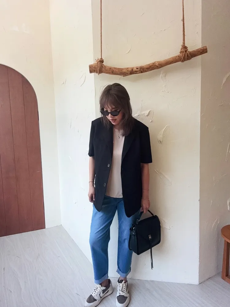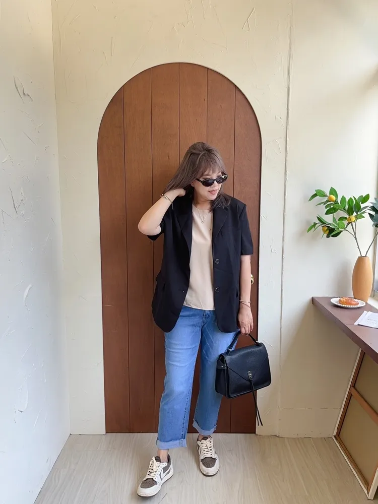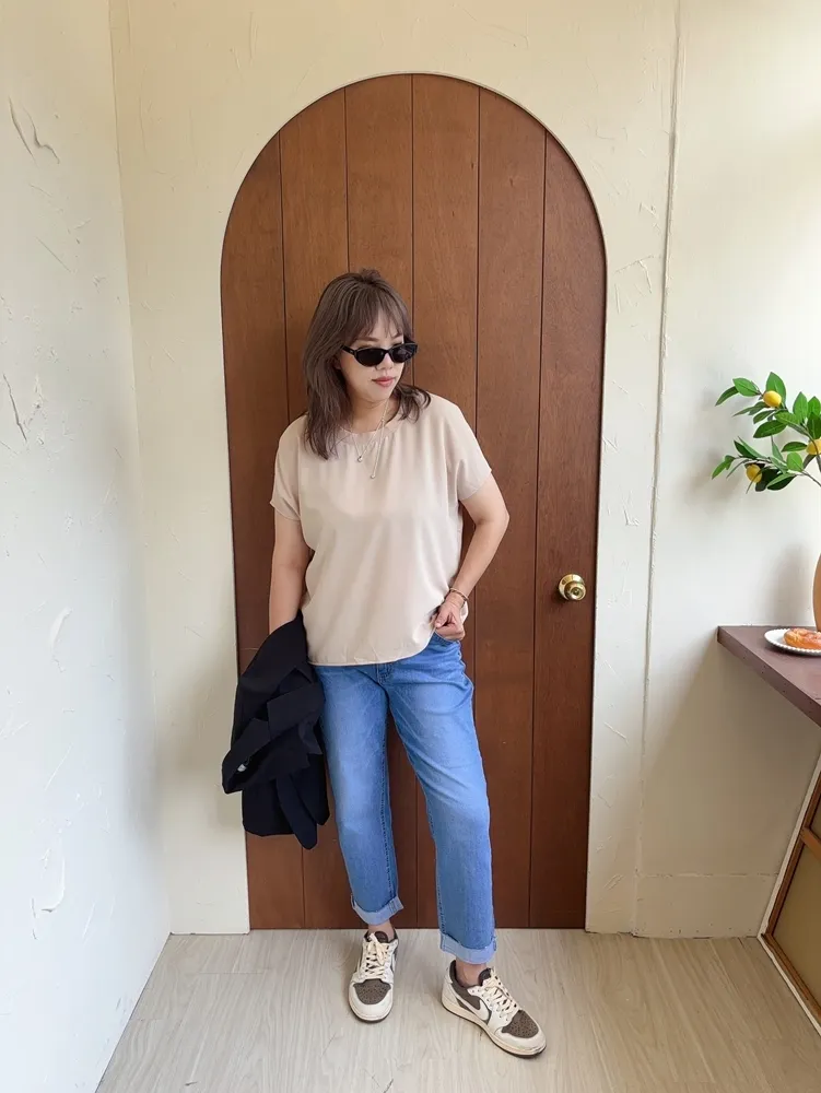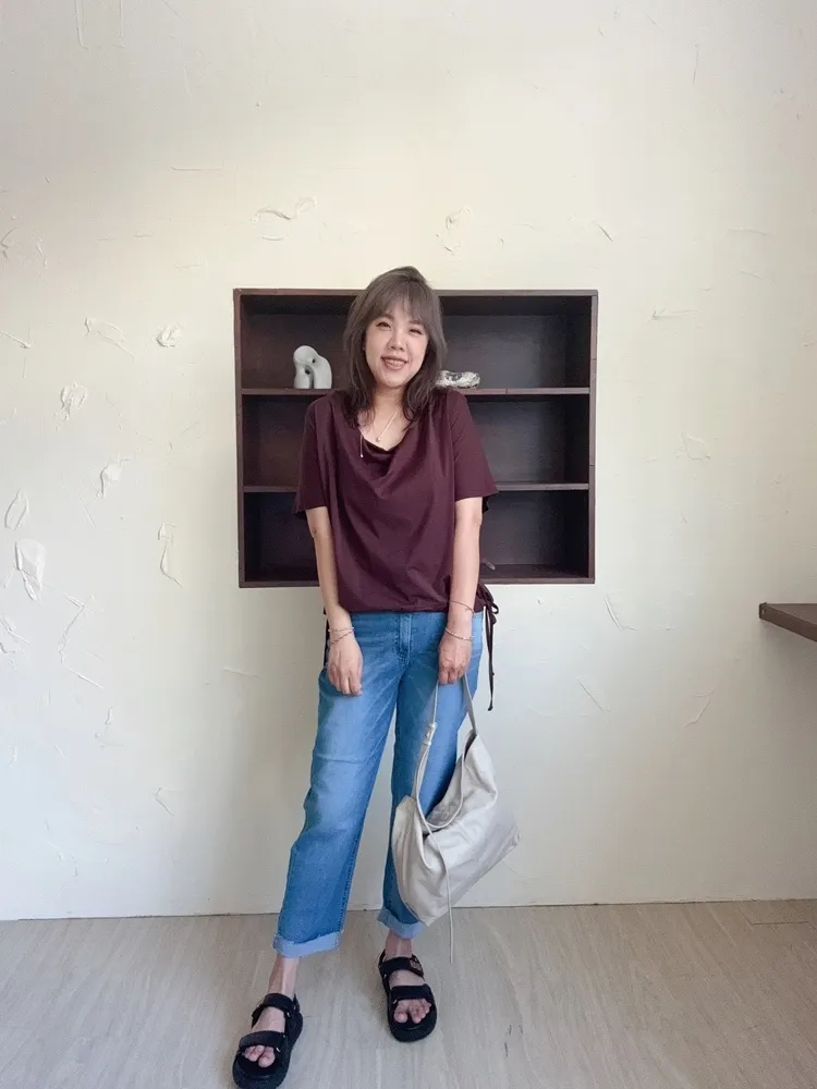 ✓ 小直筒褲型,穿至肚臍處,褲長約10分長