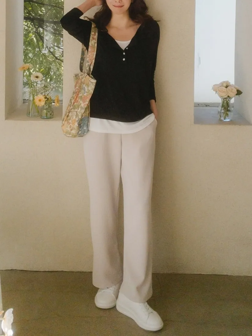 領口的釦子是可以打開來的,打開兩顆釦子露出白色的背心,整體更有休閒層次感