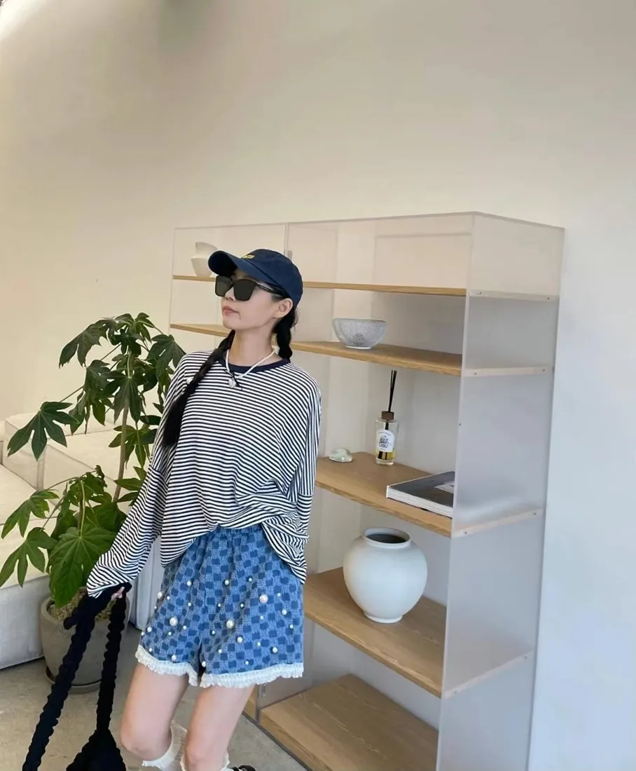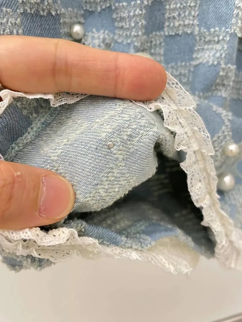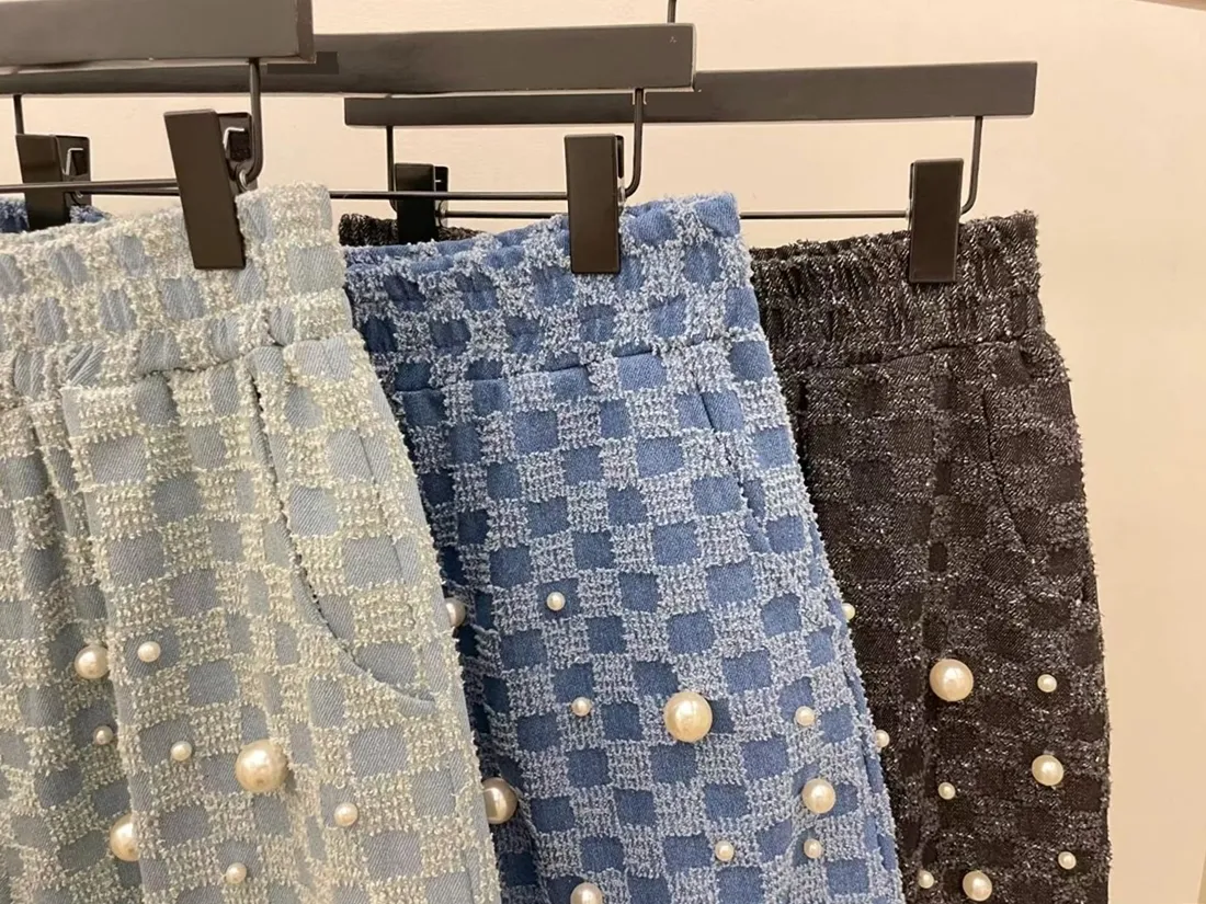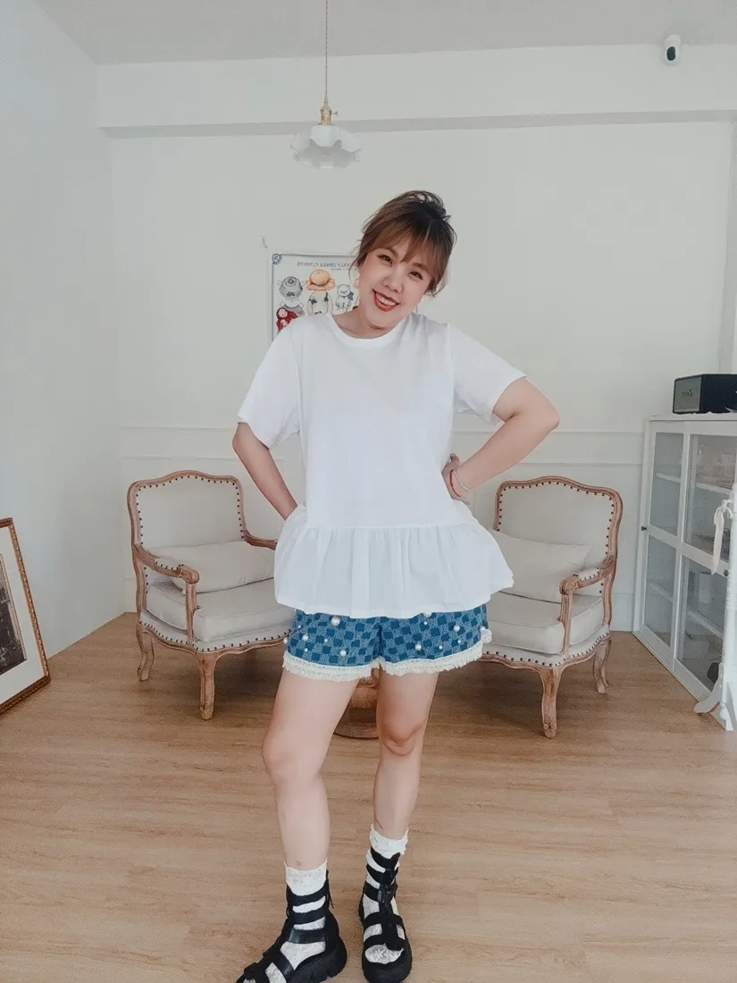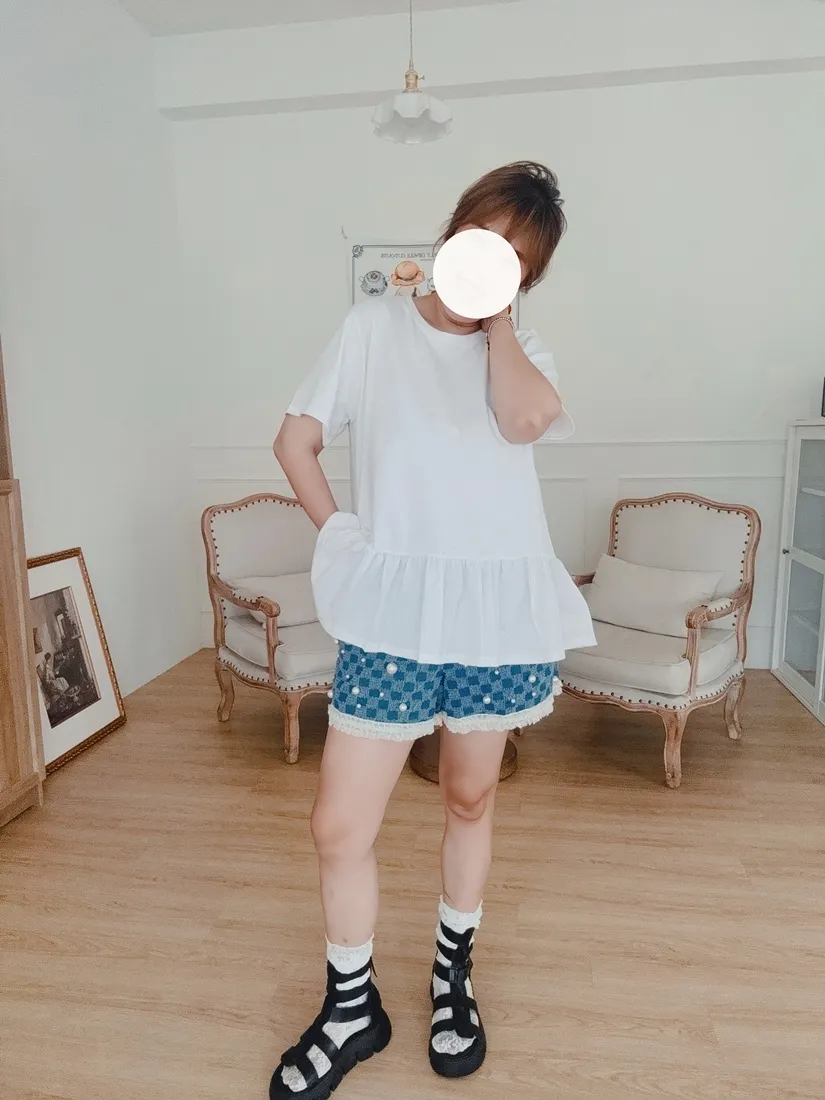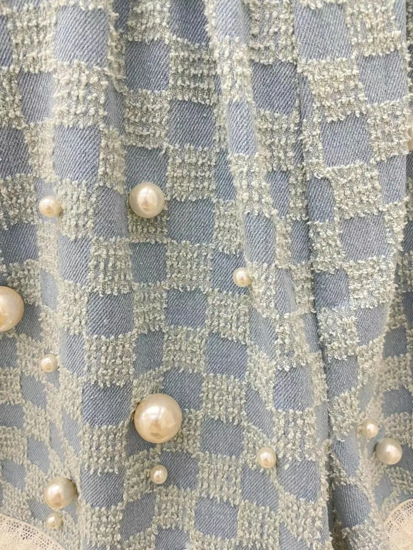 ✓ 布料表面抓破設計,釘大小珍珠裝飾(洗滌請務必手洗哦)