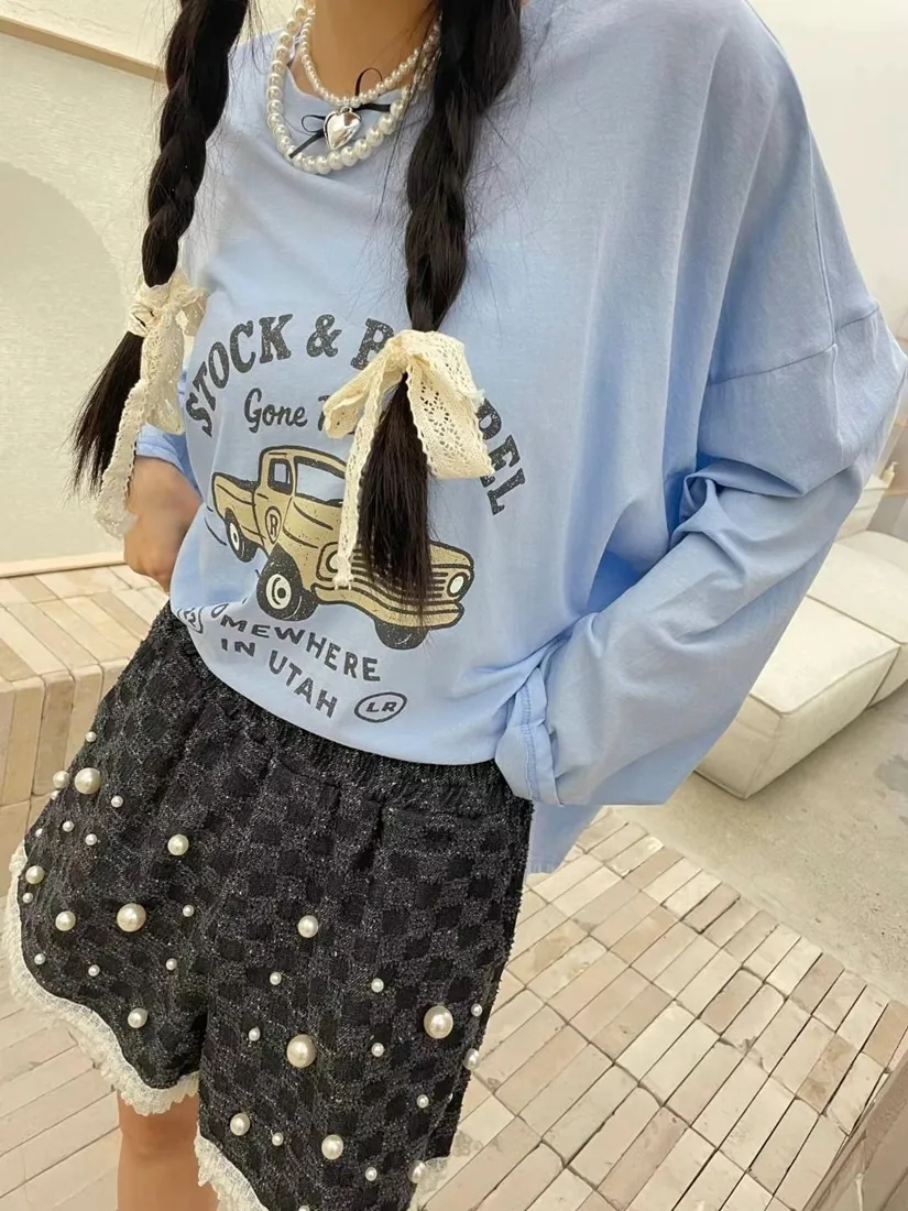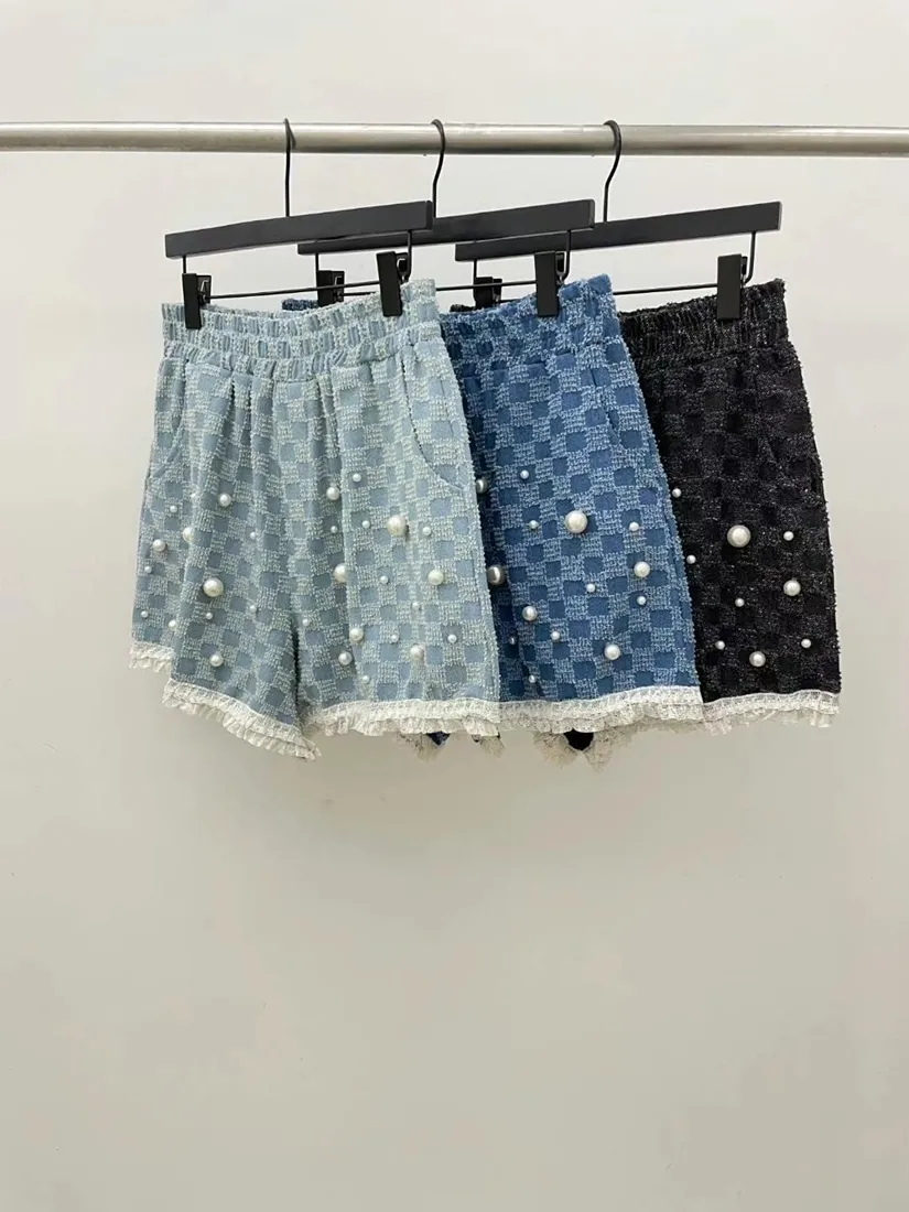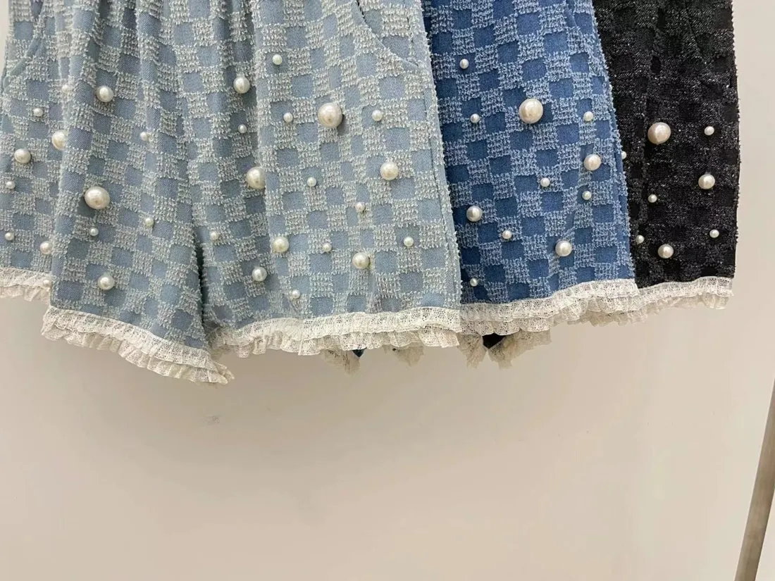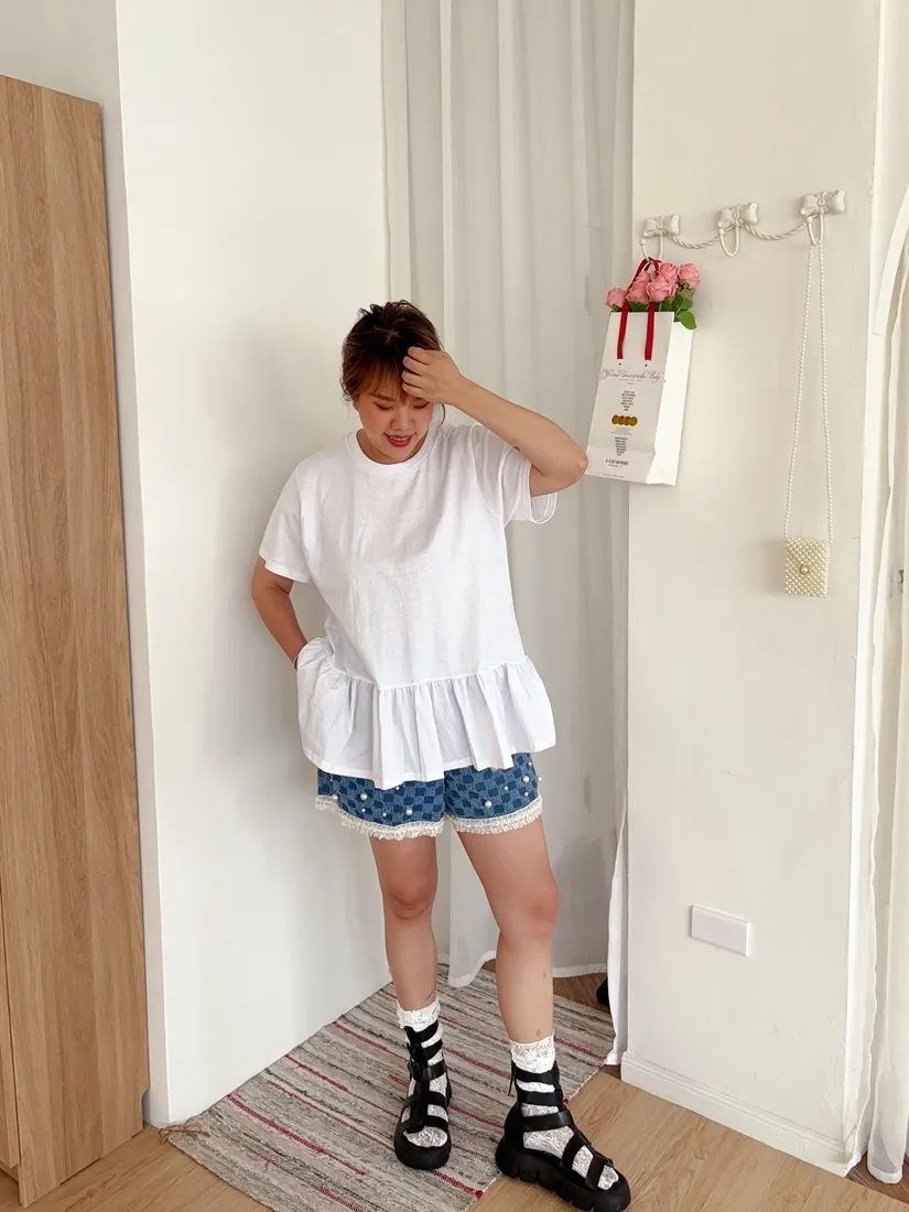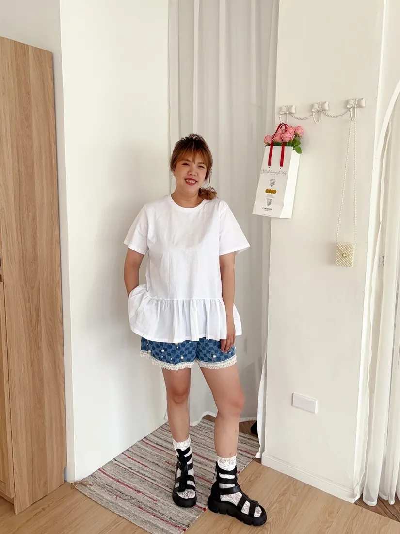 ✓ 布料表面抓破設計,釘大小珍珠裝飾(洗滌請務必手洗哦)
