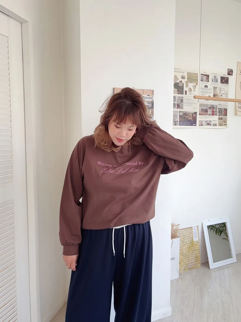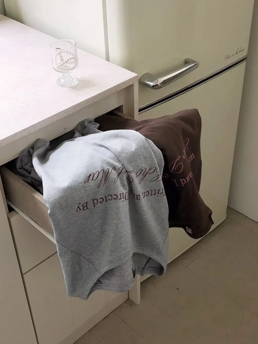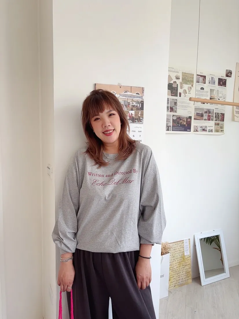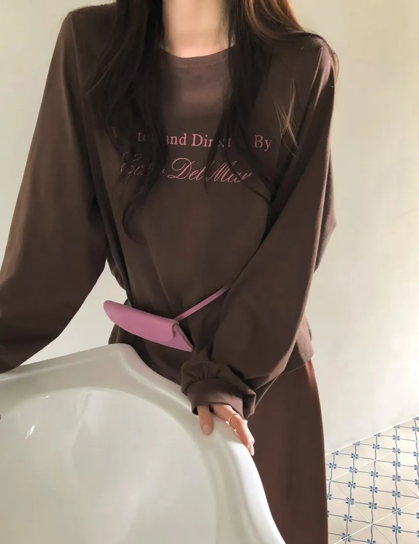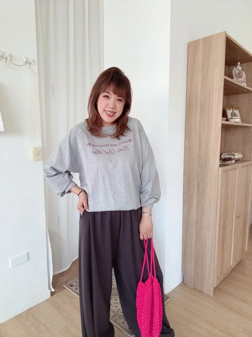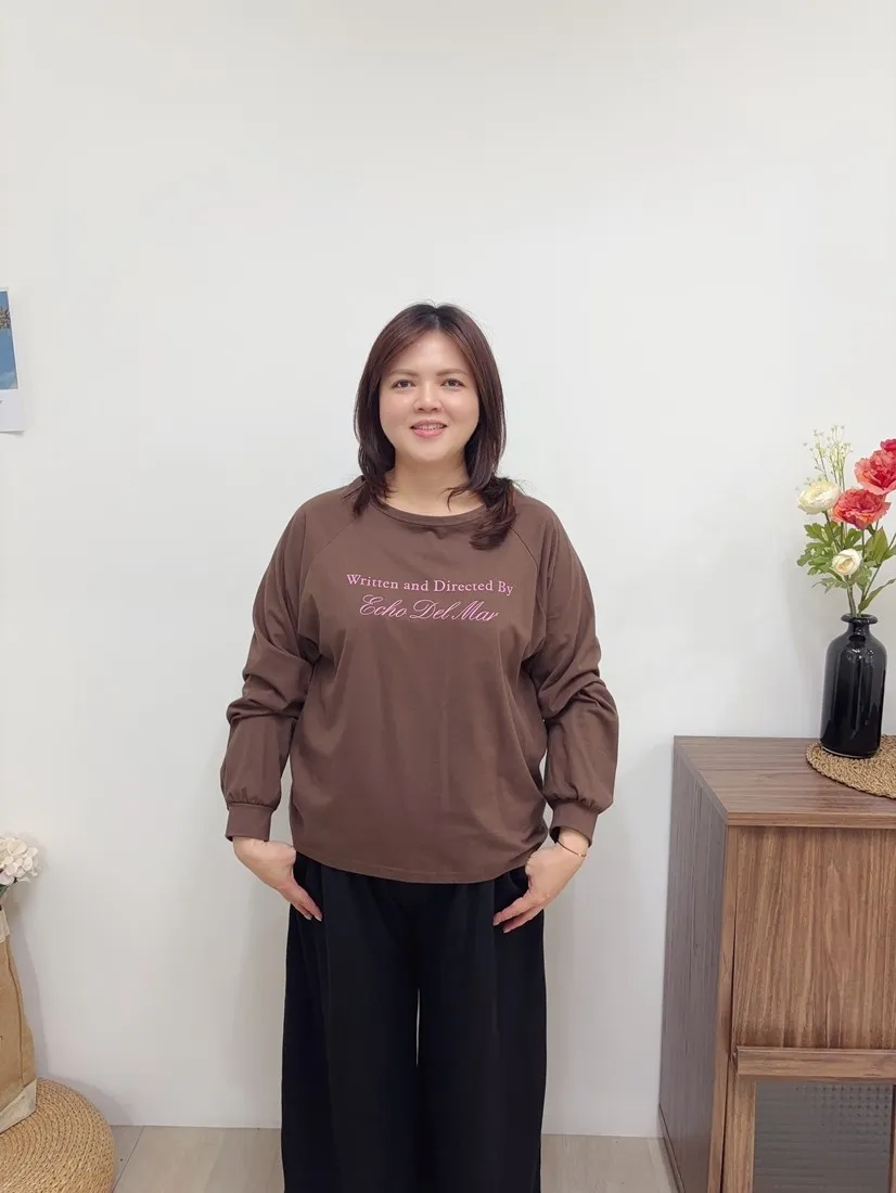 ✓ 跳色字母印刷,淺灰色上衣是酒紅色字母、咖色上衣是粉色字母