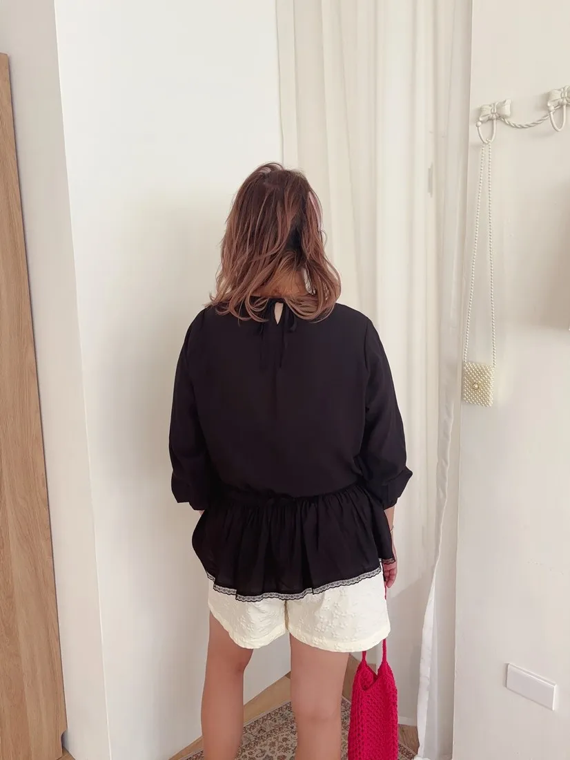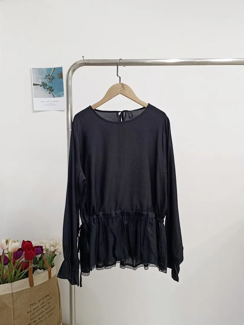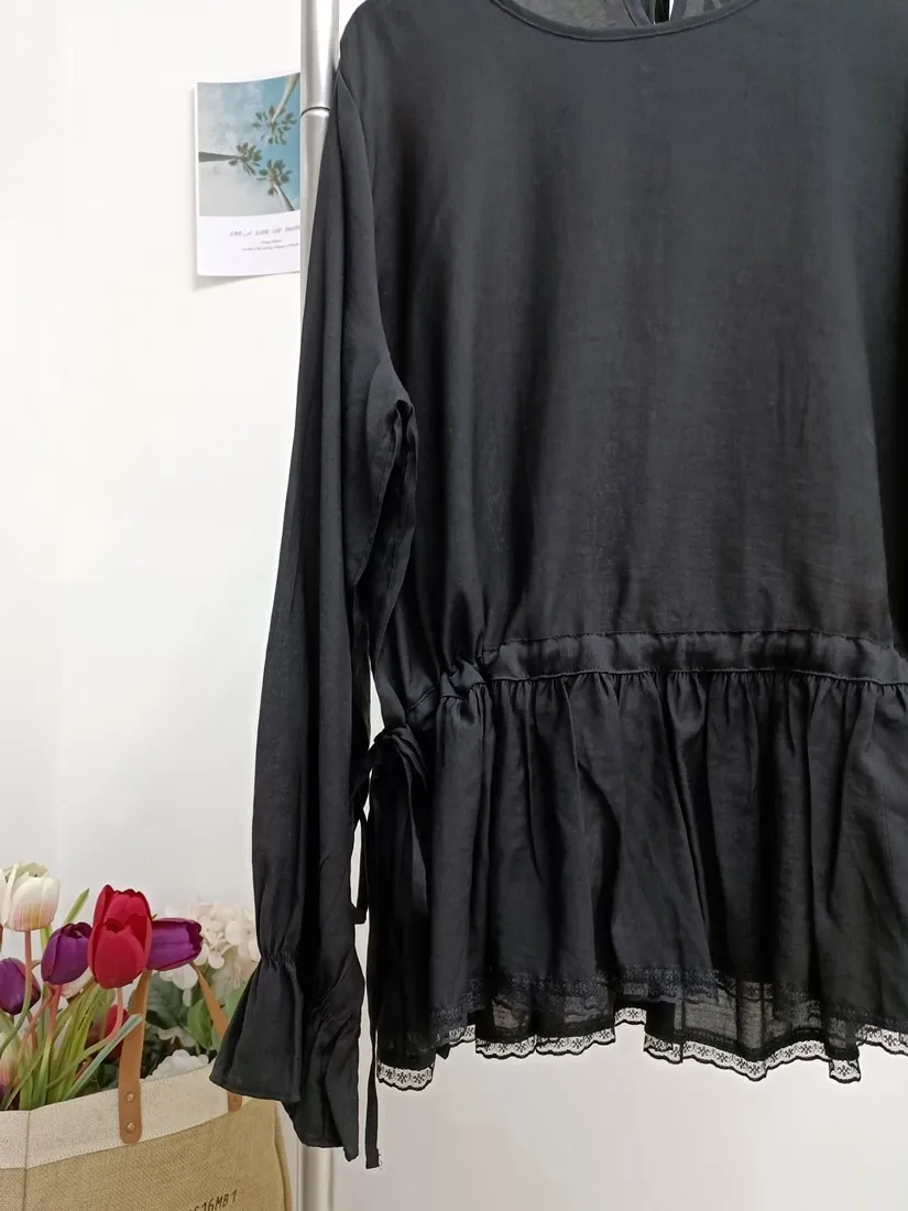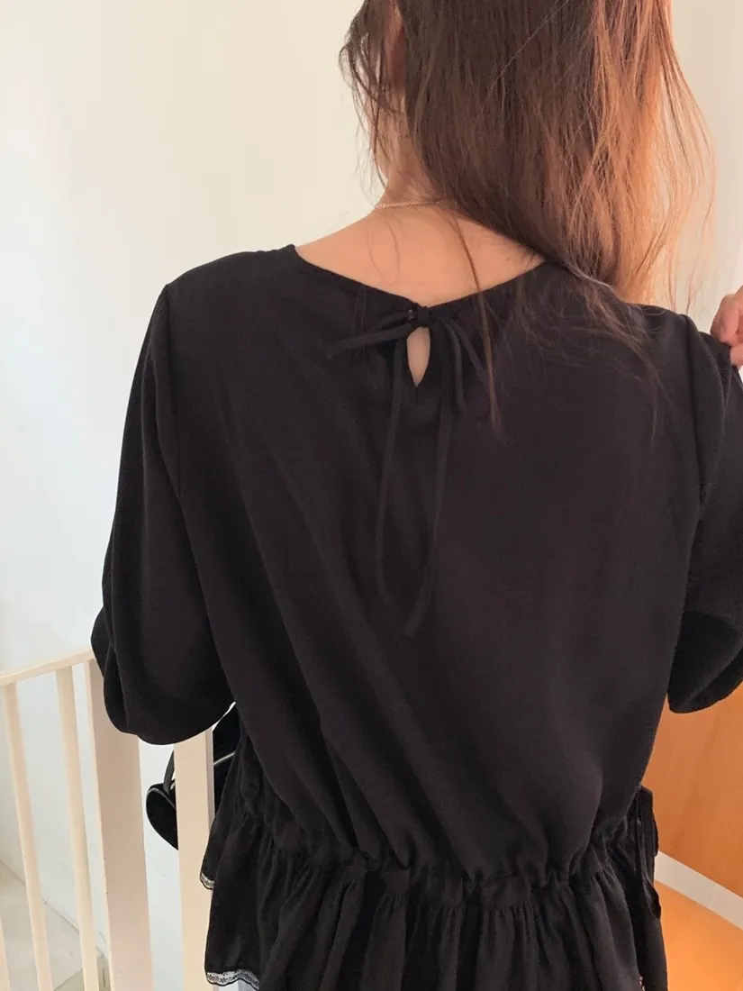 ✓ 娃娃裝版型,腰間抽繩設計,衣擺滾蕾絲邊