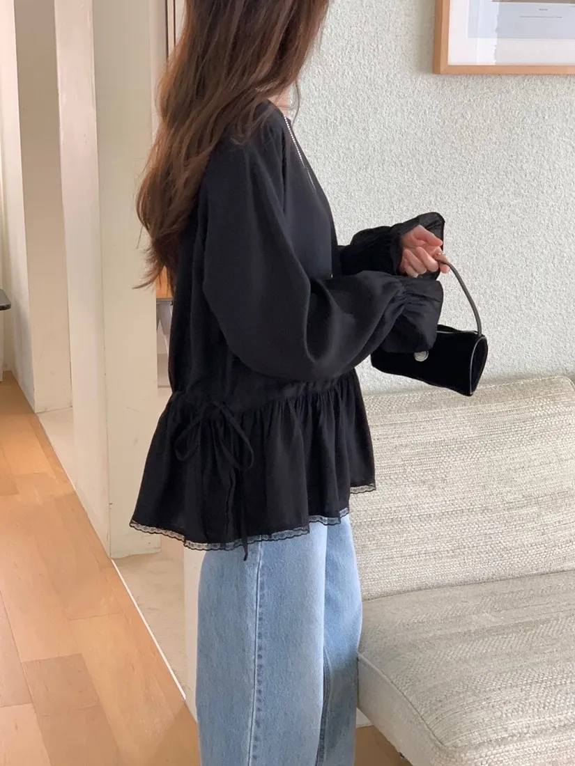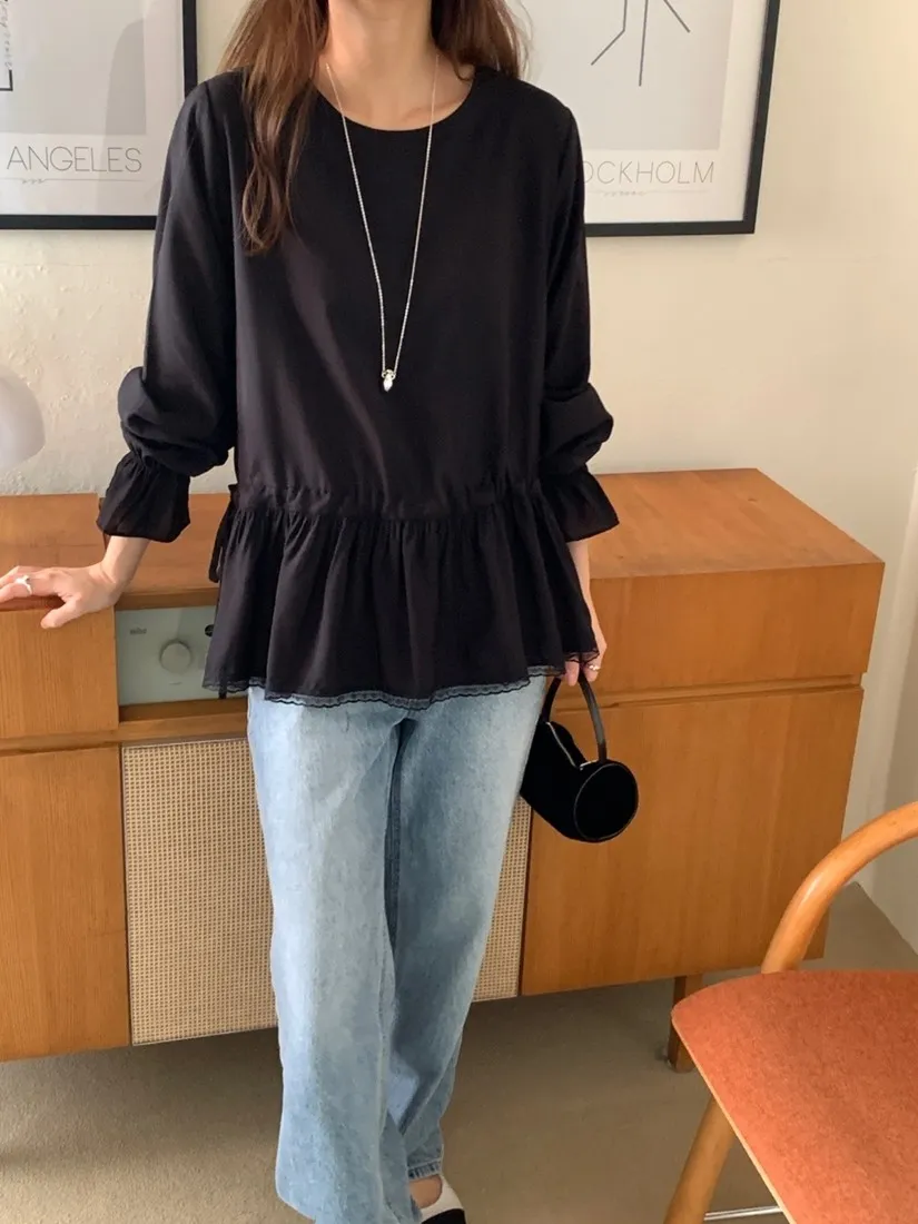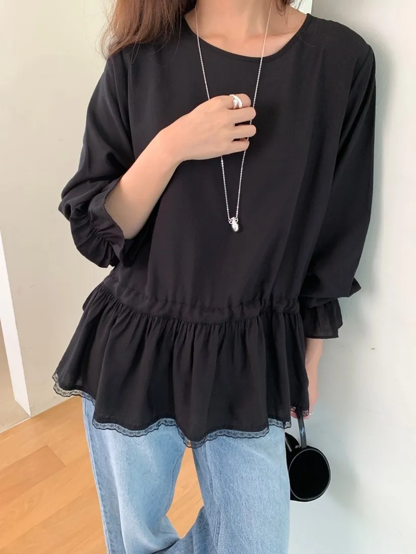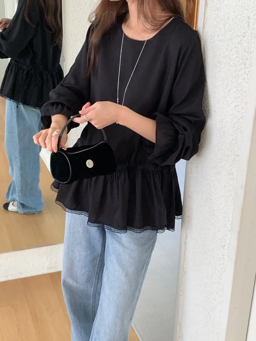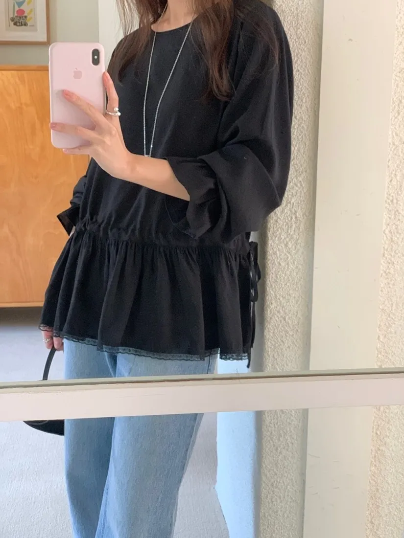 ✓ 娃娃裝版型,腰間抽繩設計,衣擺滾蕾絲邊