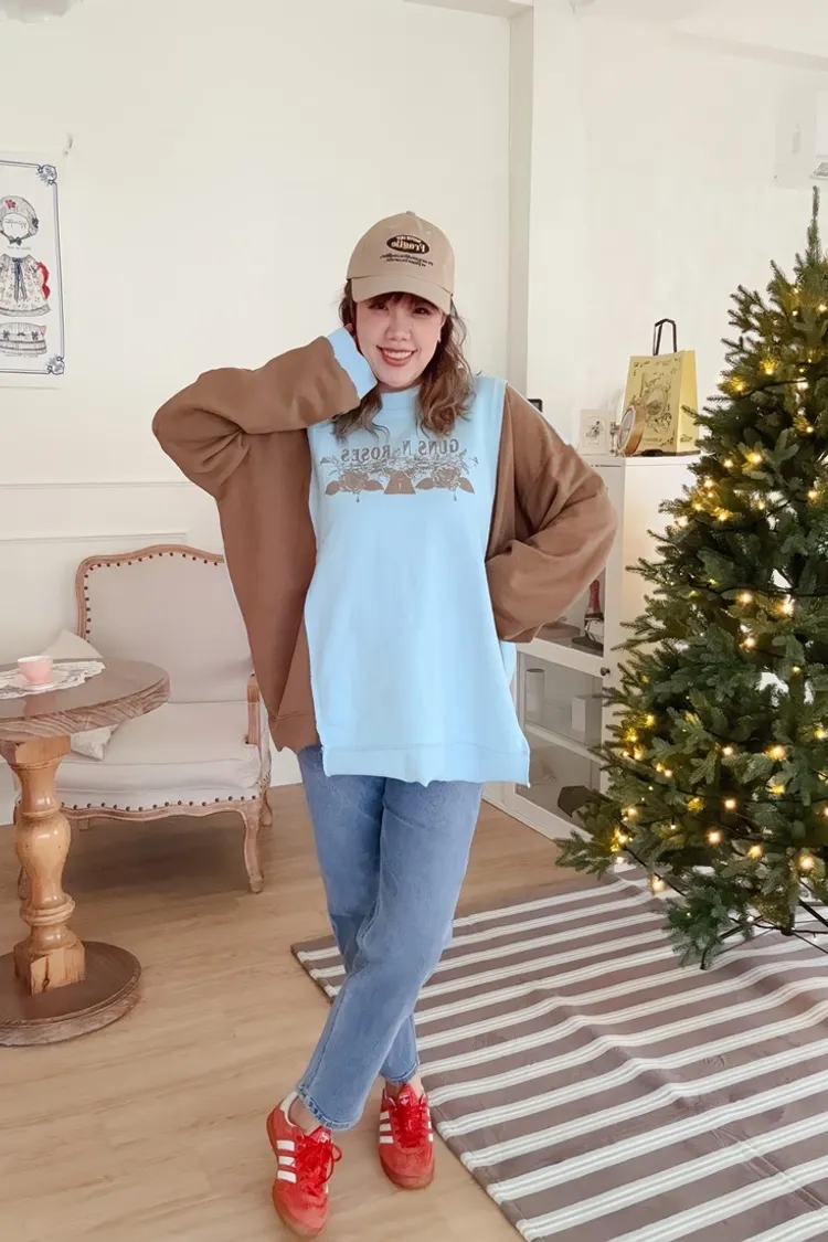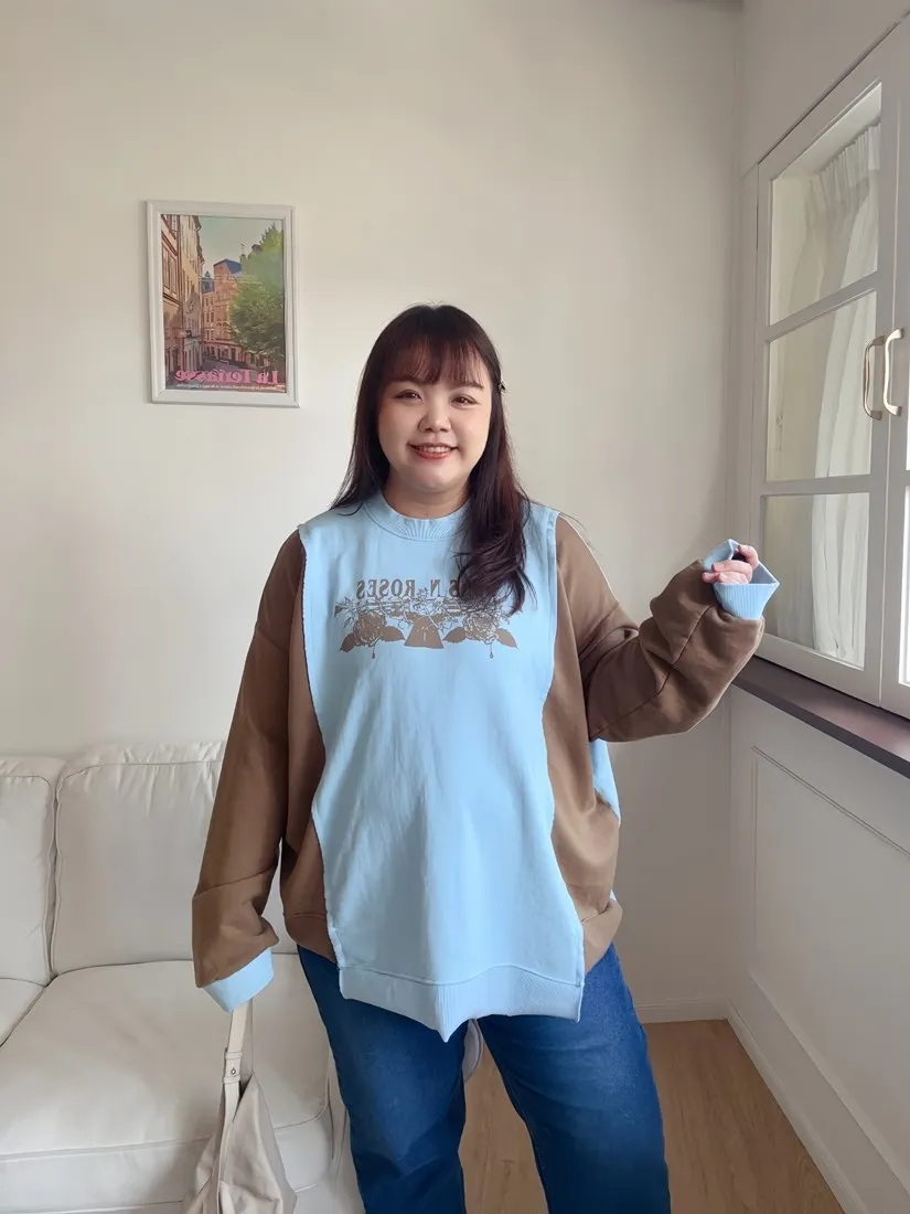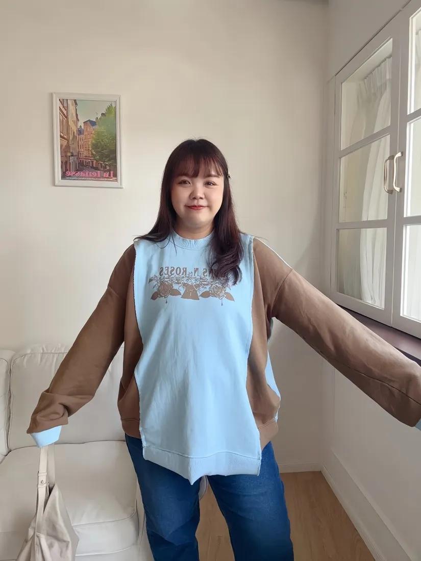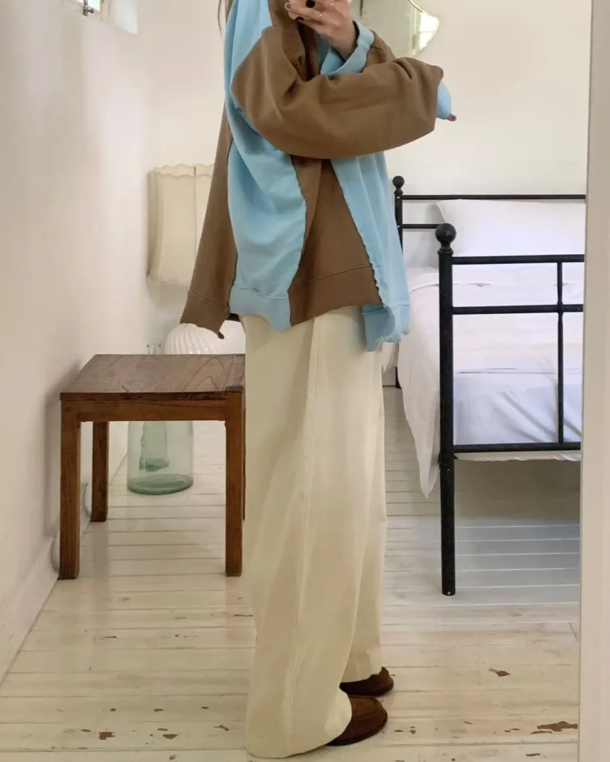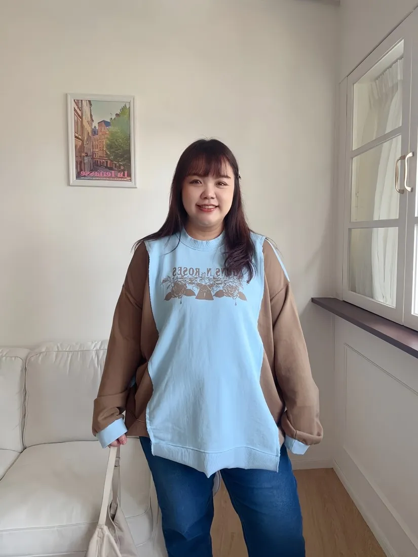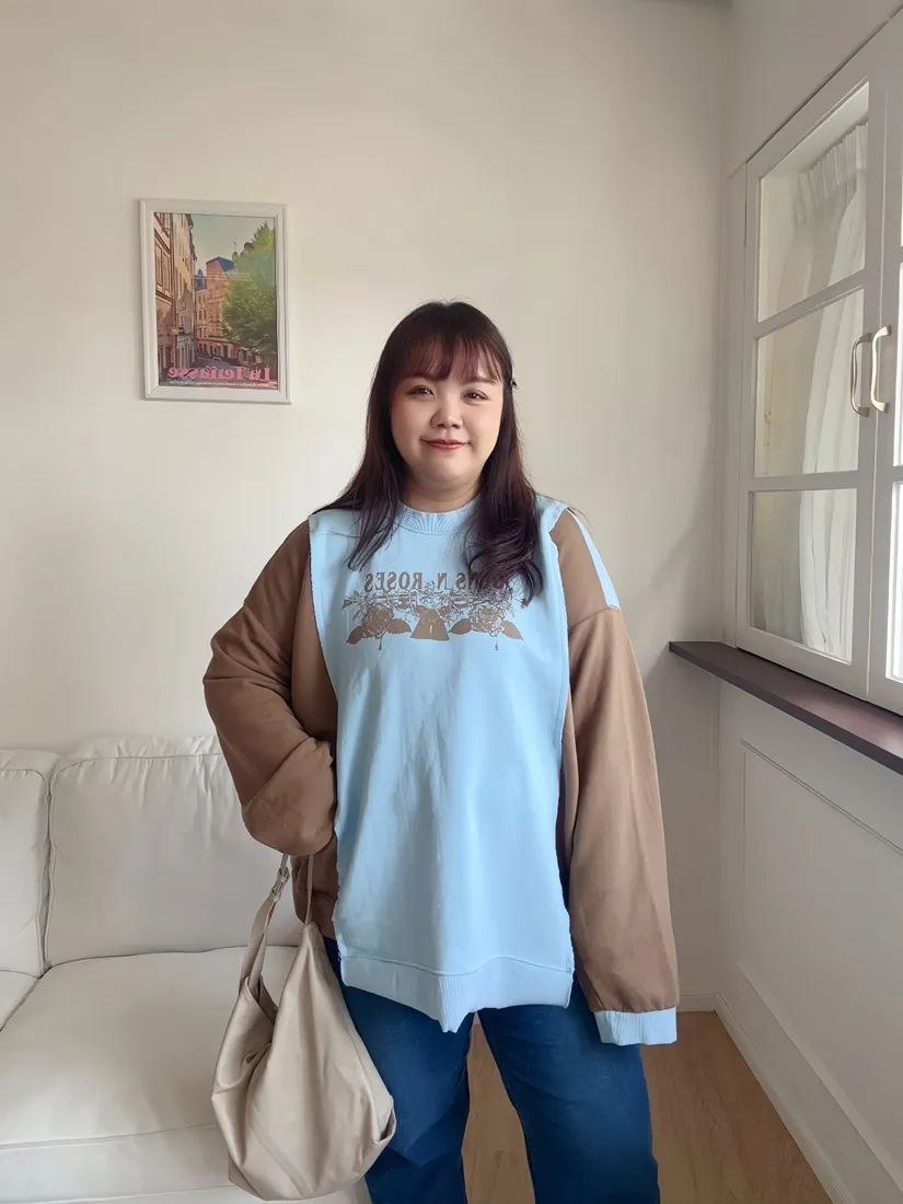 ✓ 寬鬆方形版型,拼接不同顏色,讓大大的衣服切割成小小塊,整體就不會被放大哦