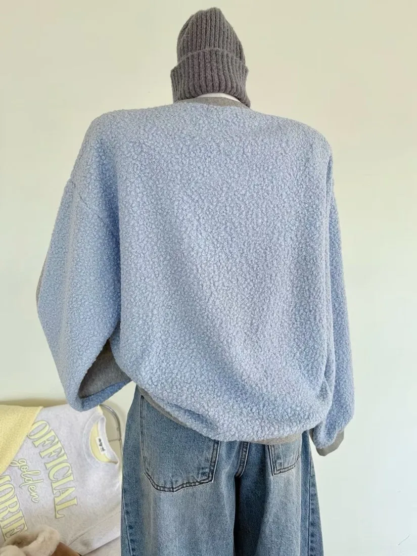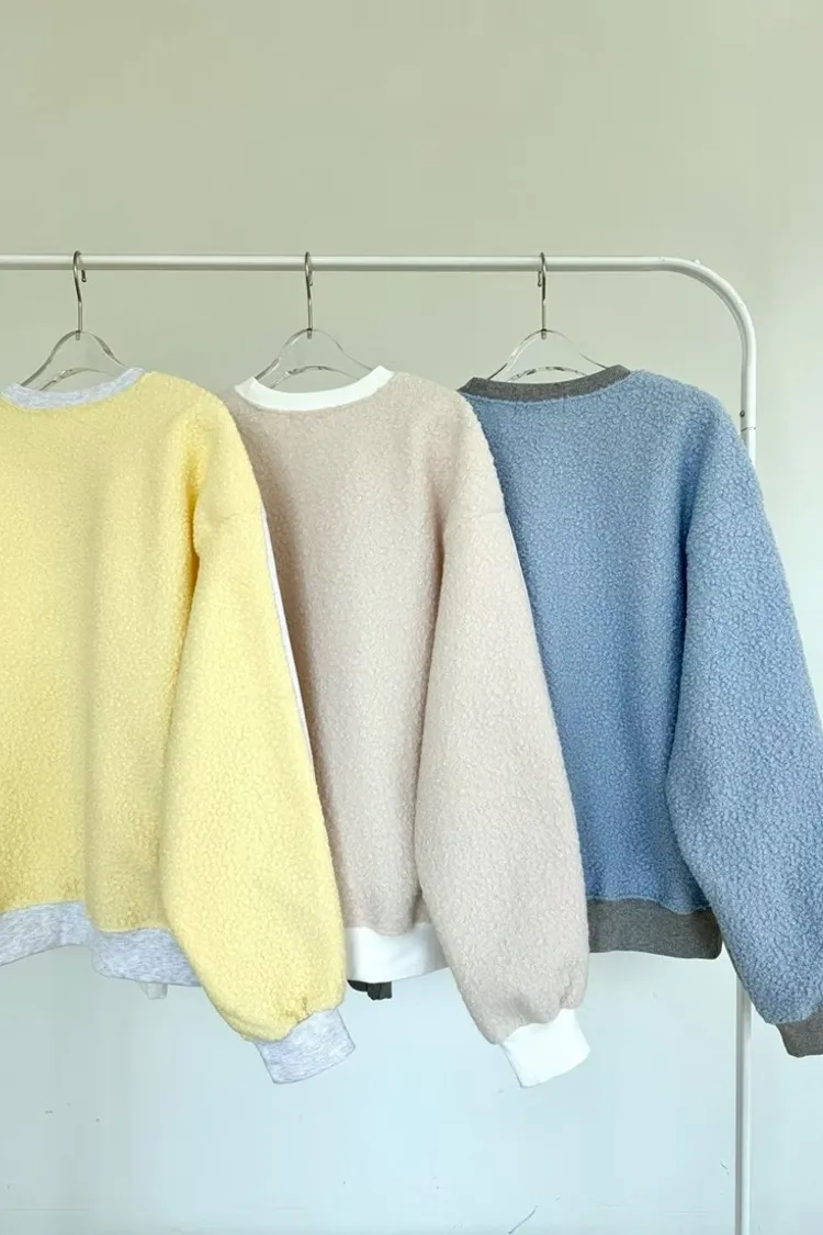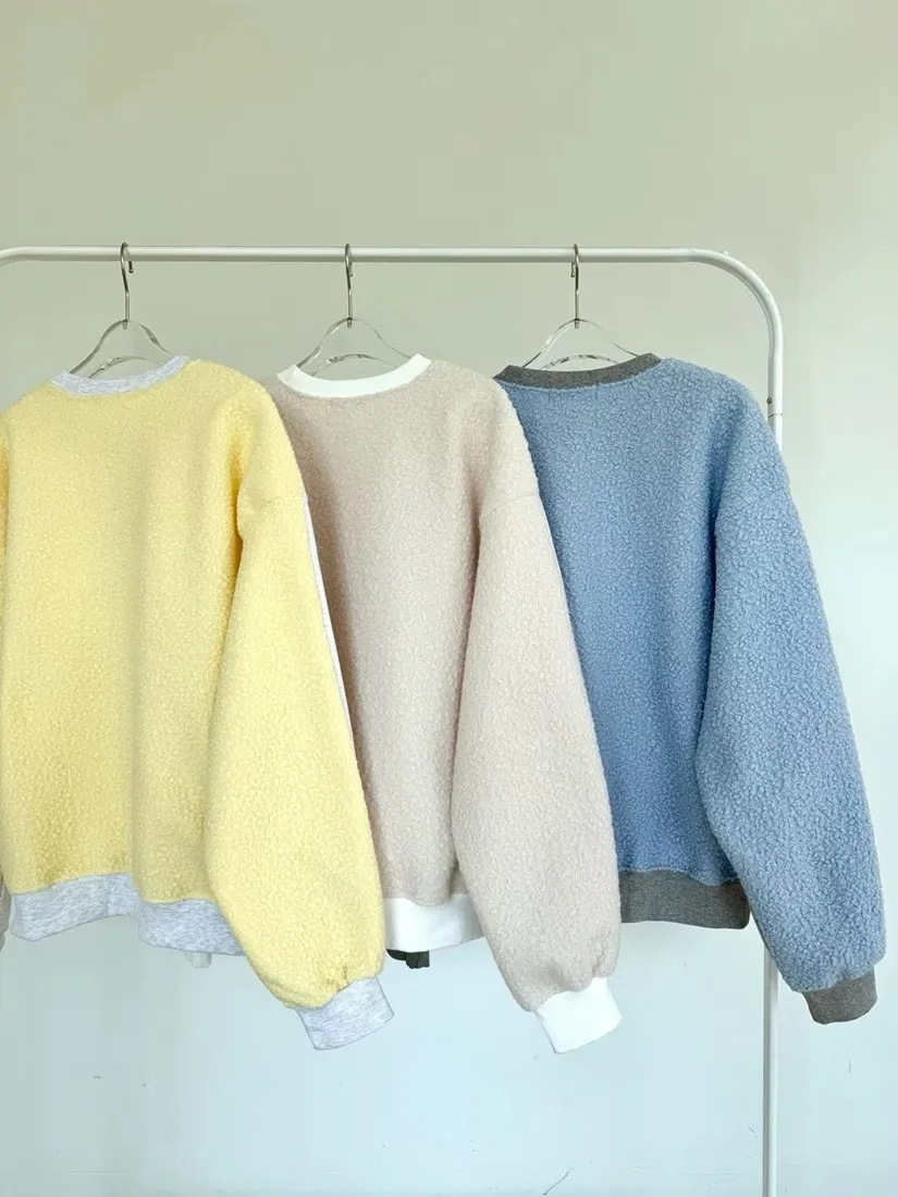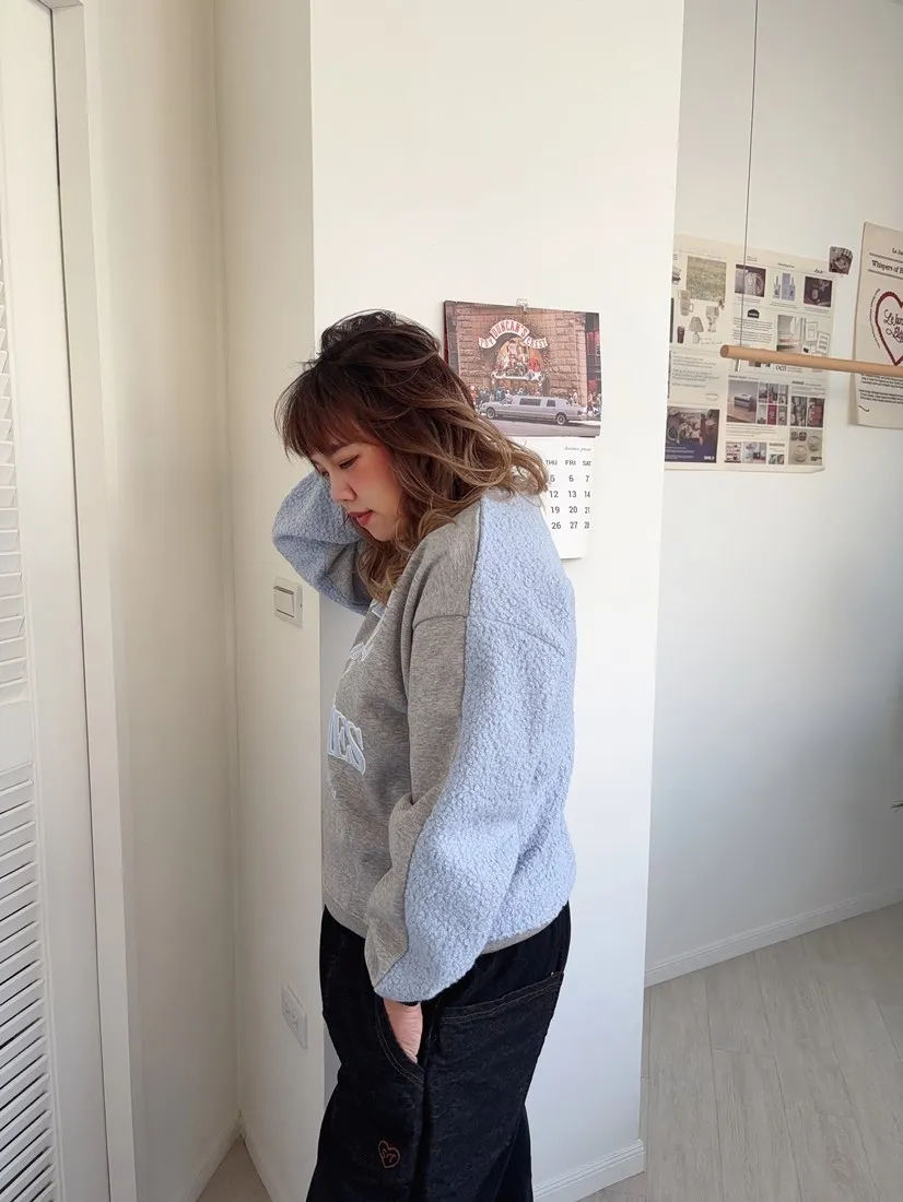 ✓ 異材質拼接,正面類太空棉棉質,內裡有刷毛;背面捲捲羊羔絨材質